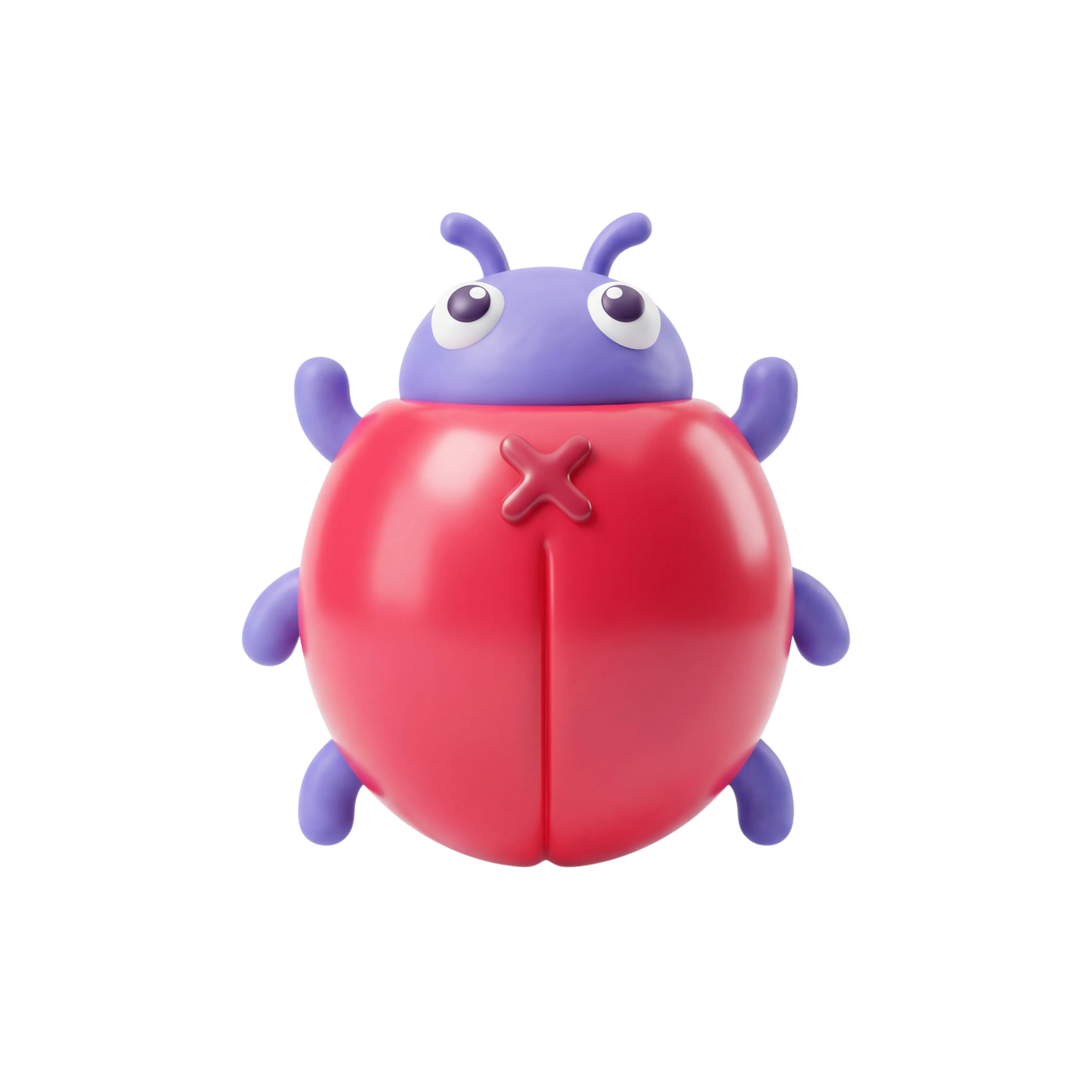 A high-quality 3D illustration of a stylized bug representing an error or glitch icon. The object is made of glossy plastic material featuring a red body and purple limbs, enhanced with a bold 'X' mark to symbolize malfunction or bug detection, often used in UI/UX, software design, or error page visuals.