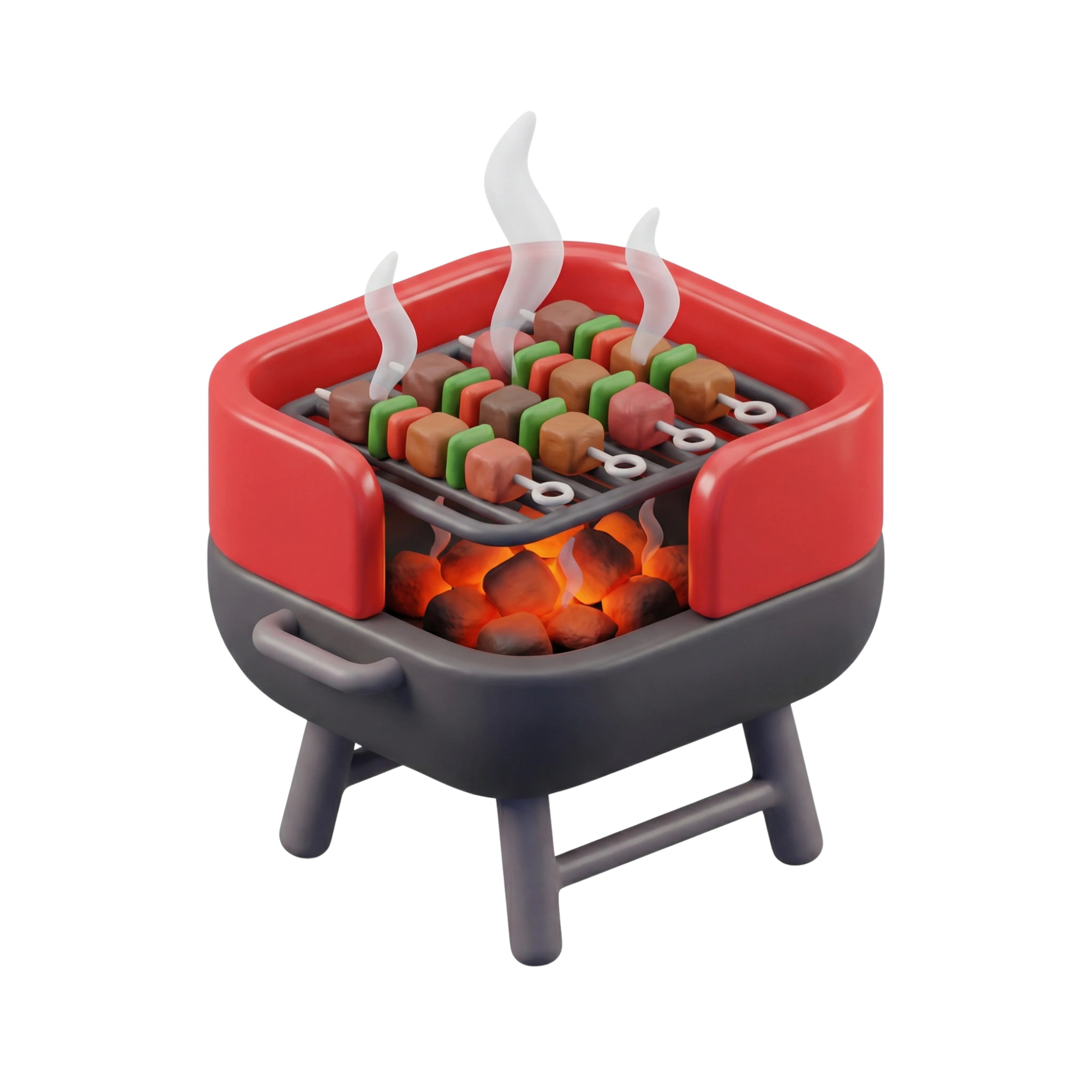 مجسم ثلاثي الأبعاد نابض بالحياة لشواية فحم تحتوي على أسياخ مشاوي، مصممة بخامة بلاستيكية غير لامعة وفحم متوهج. مثالية للاستخدام في واجهات التطبيقات، أيقونات الطهي، أو الرسوم التوضيحية الخاصة بالطعام.