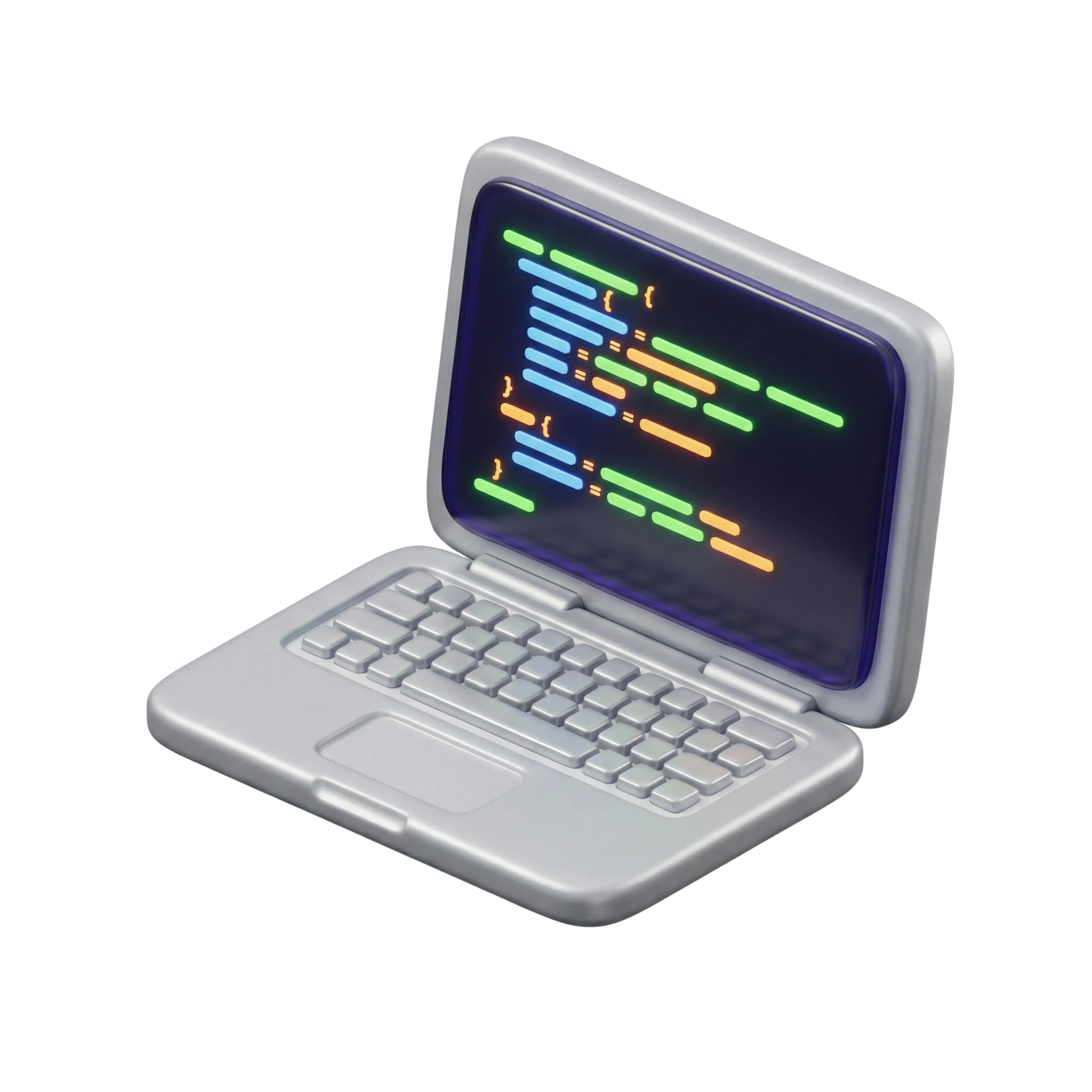 مجسم ثلاثي الأبعاد عالي الدقة لجهاز كمبيوتر محمول بتصميم فضي معدني وشاشة لامعة تعرض أسطر برمجية ملونة. مثالي للاستخدام في عروض تطوير البرمجيات، العروض التقنية، نماذج واجهات المستخدم، والمحتوى التعليمي الرقمي.