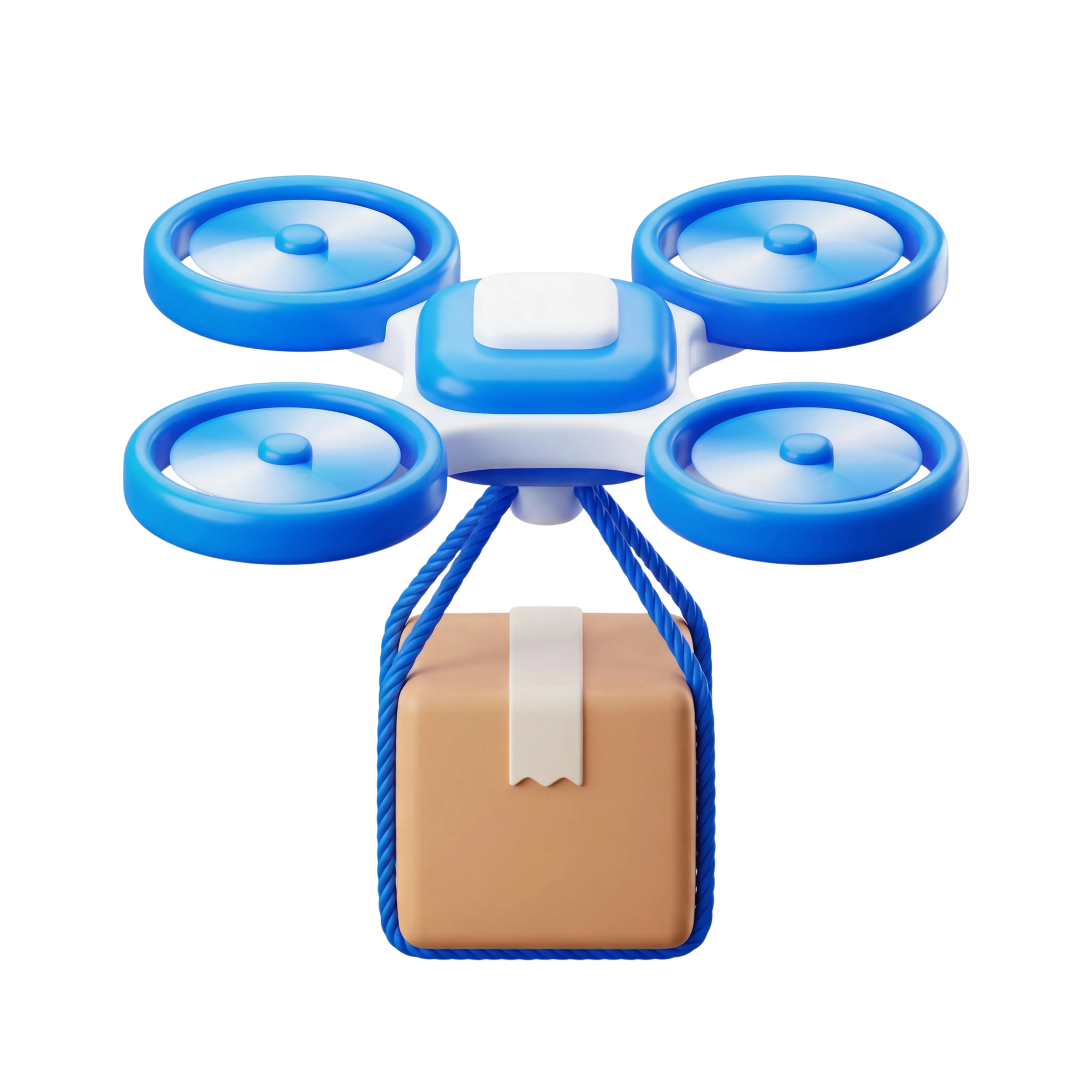 أيقونة ثلاثية الأبعاد مصممة لطائرة توصيل بأربعة مراوح زرقاء غير لامعة وهيكل أبيض وأزرق، تحمل صندوقًا بنيًا مغلفًا بدقة. مثالية لتطبيقات الخدمات اللوجستية أو واجهات خدمات التوصيل أو التصاميم التقنية المستقبلية.