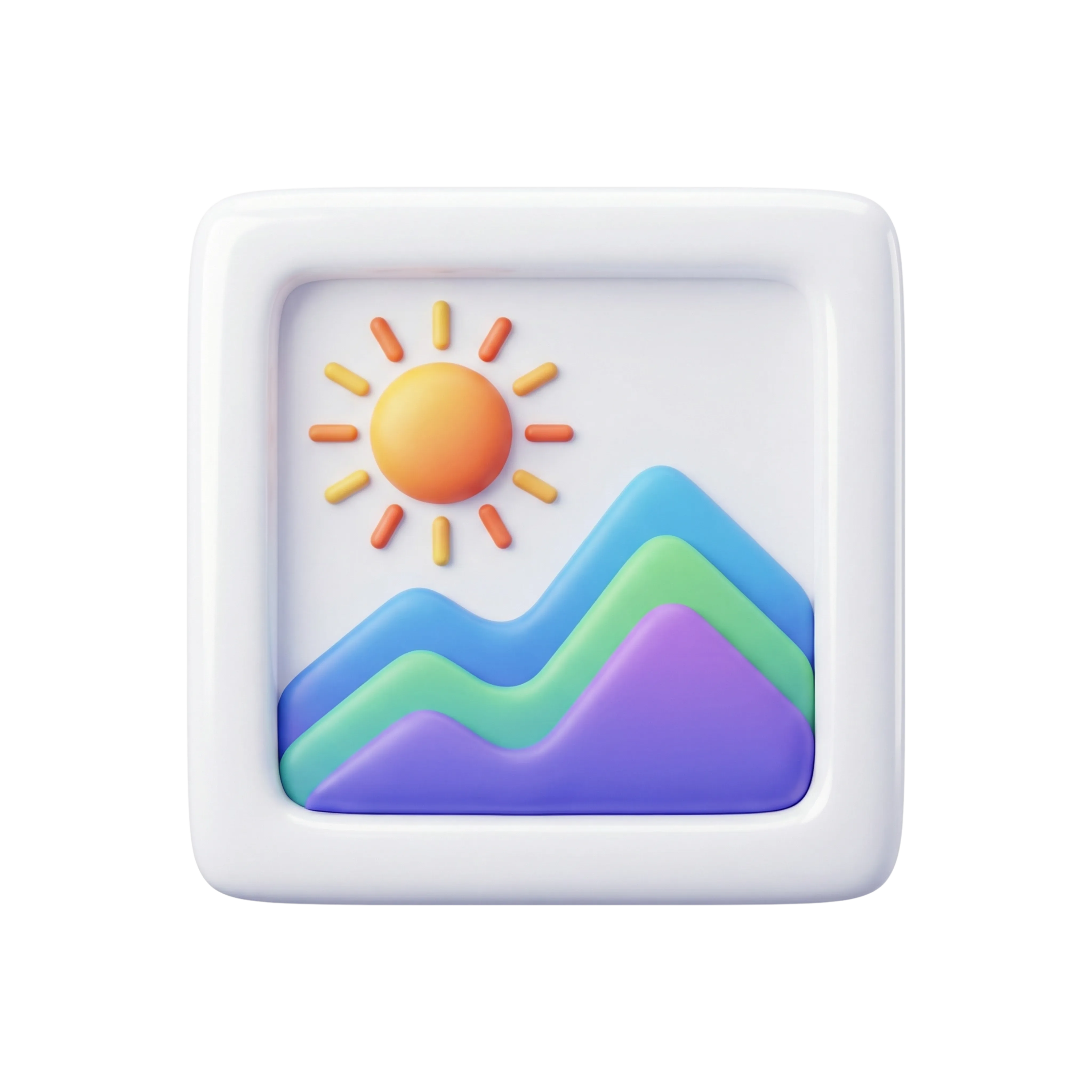 A high-quality 3D rendering of a gallery or image icon, designed with a glossy white frame and vibrant colorful inner landscape. The icon is suitable for mobile app interfaces, UI/UX projects, and digital platforms requiring modern visual assets.