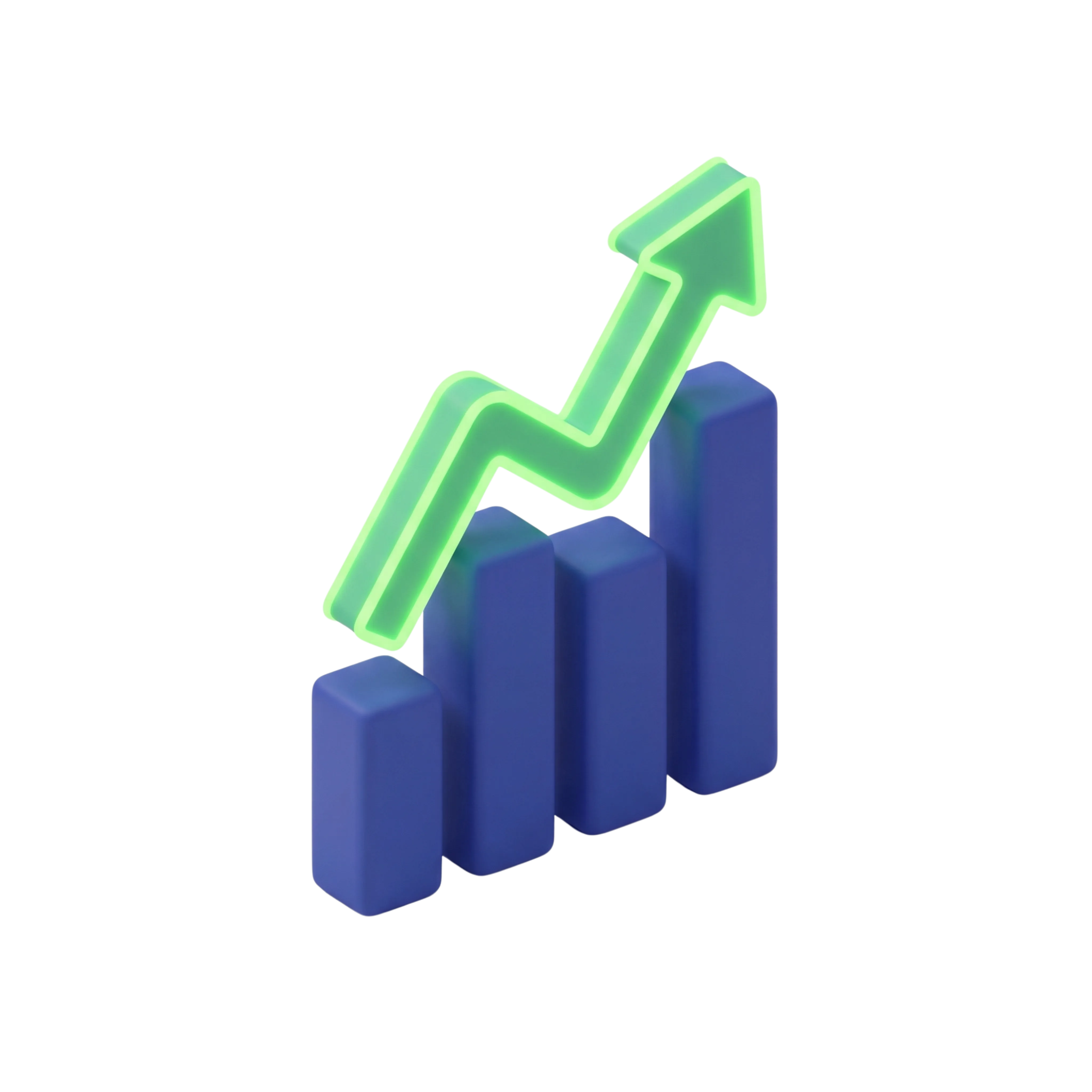 أيقونة ثلاثية الأبعاد عالية الجودة لمخطط أعمدة رأسي باللون الأزرق غير اللامع وسهم نيون أخضر لامع يشير إلى النمو. مناسب لتصاميم الأعمال، لوحات التحكم المالية، العروض التقديمية، أو واجهات التطبيقات التي تعرض التقدم أو الأداء أو التحليلات.