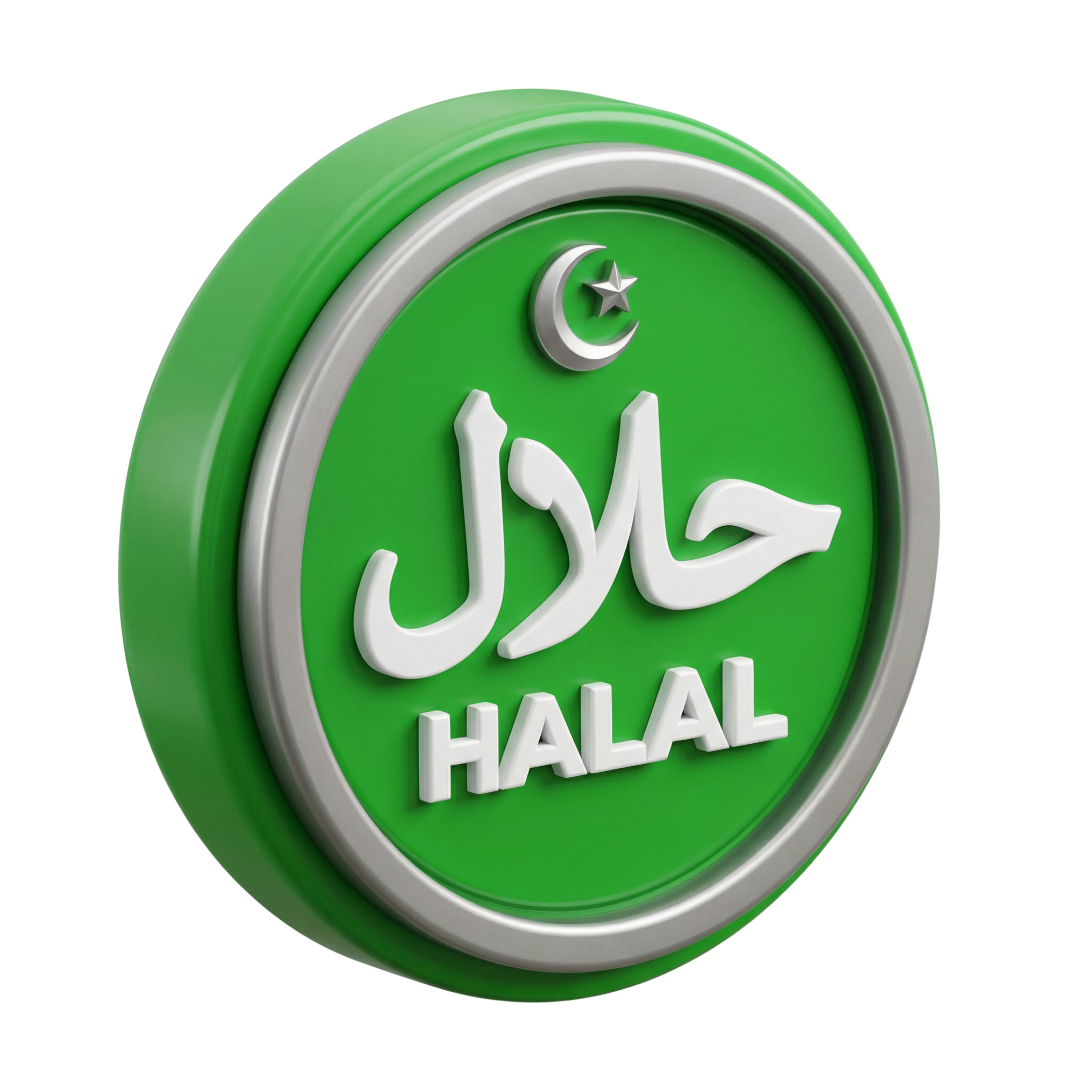مجسم ثلاثي الأبعاد عالي الدقة لختم شهادة الحلال، بتصميم دائري بلون أخضر لامع وحواف فضية، يحتوي على نص 'حلال' باللغتين العربية والإنجليزية مع رمز الهلال والنجمة. مناسب لتصاميم تغليف المنتجات، بطاقات الشهادات الرقمية، والعلامات التجارية الإسلامية.