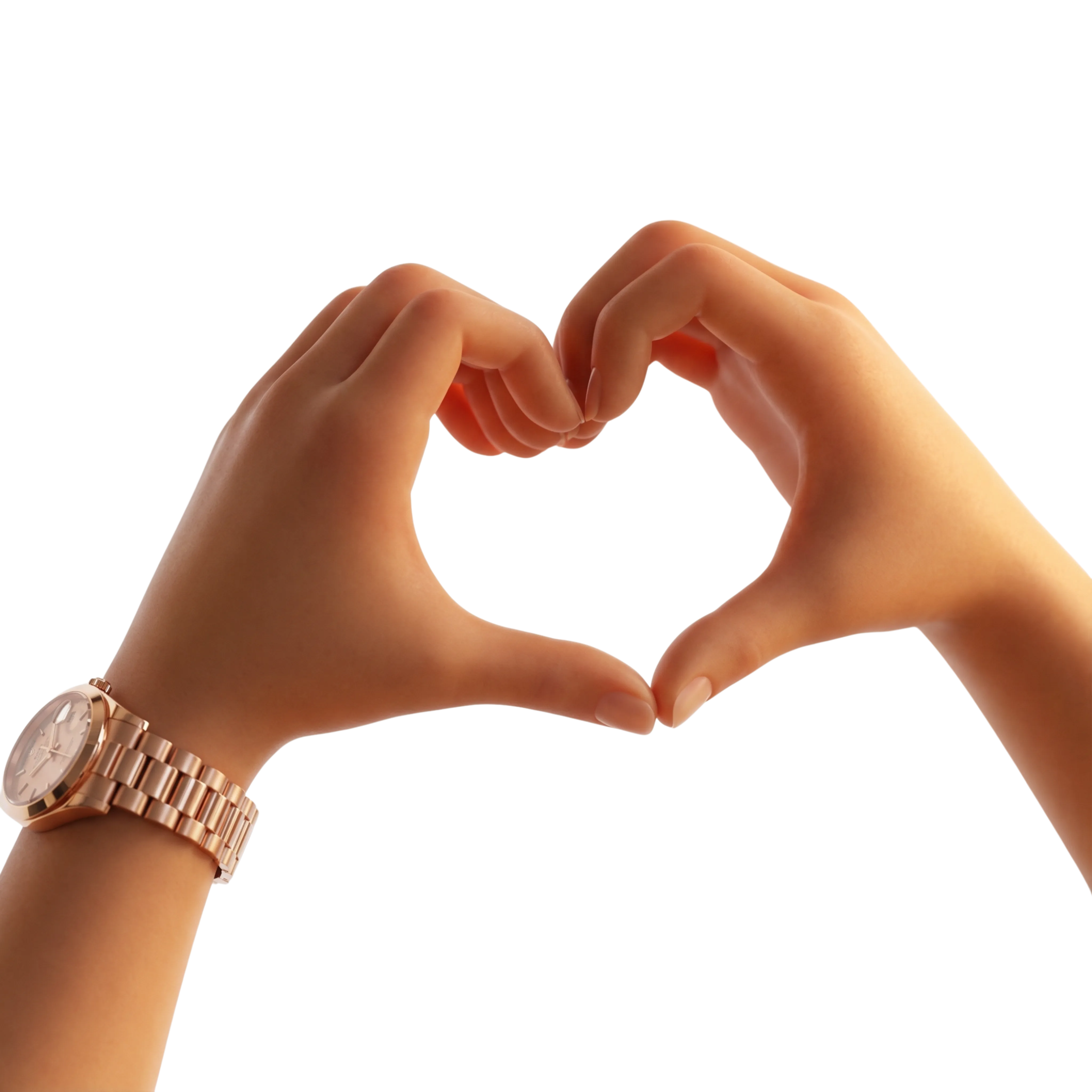 مجسم ثلاثي الأبعاد عالي الجودة ليدين بشريتين واقعيتين تُشكلان إيماءة على شكل قلب، ترمز إلى الحب أو التقدير. تتميز اليدان بملمس غير لامع وإضاءة ناعمة، مع ساعة أنيقة بلون ذهبي وردي على المعصم الأيسر. مناسب لتصاميم وسائل التواصل الاجتماعي، وتطبيقات الهواتف، وبطاقات التهنئة، والمناسبات الرومانسية.