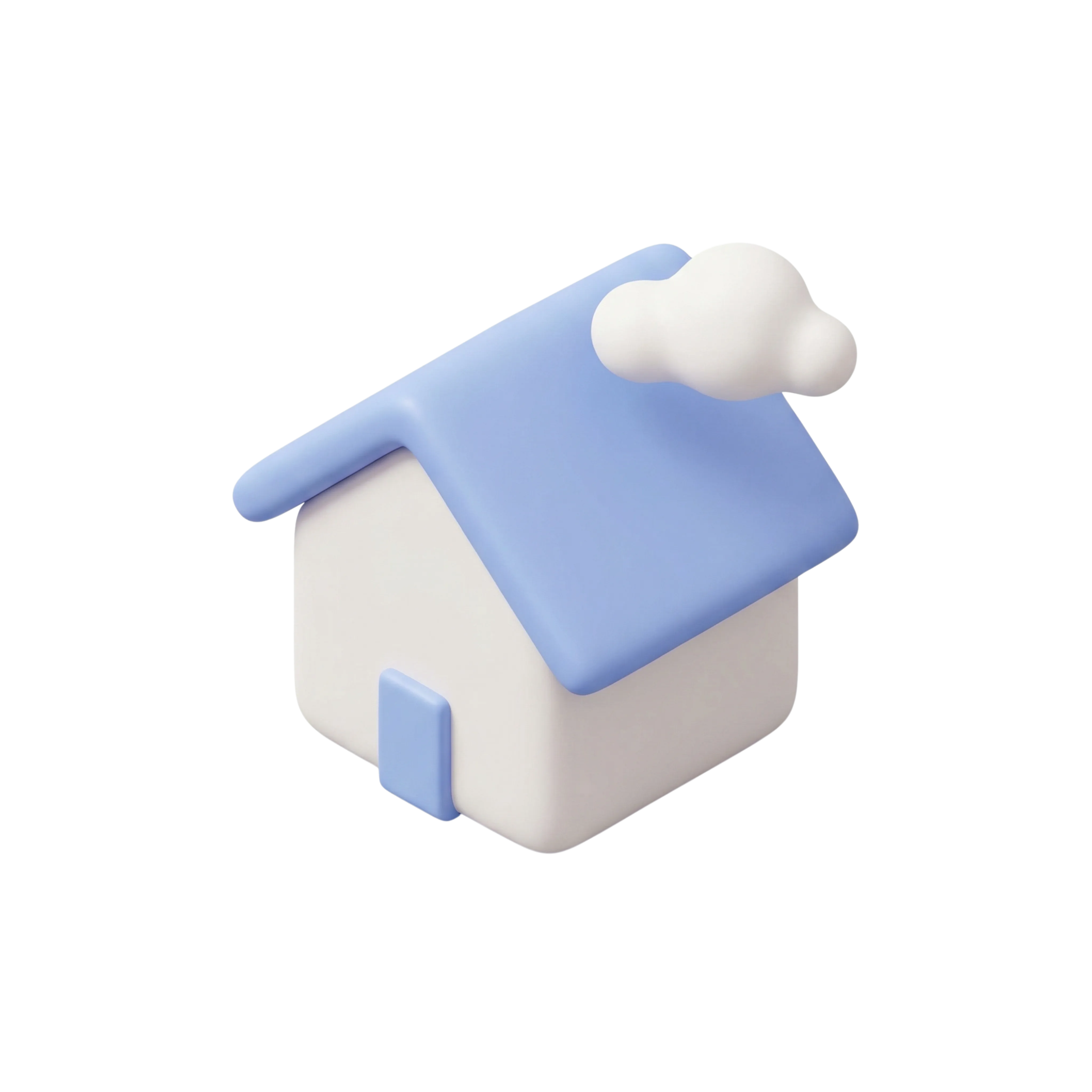 أيقونة منزل ثلاثية الأبعاد بتصميم بسيط ومادة مطفية ناعمة. السقف باللون الأزرق الفاتح مع سحابة بيضاء ناعمة، يرمز إلى التخزين السحابي أو الشبكات المنزلية. مثالية لتصاميم التطبيقات، والعروض التقنية، ولوحات التحكم الرقمية.