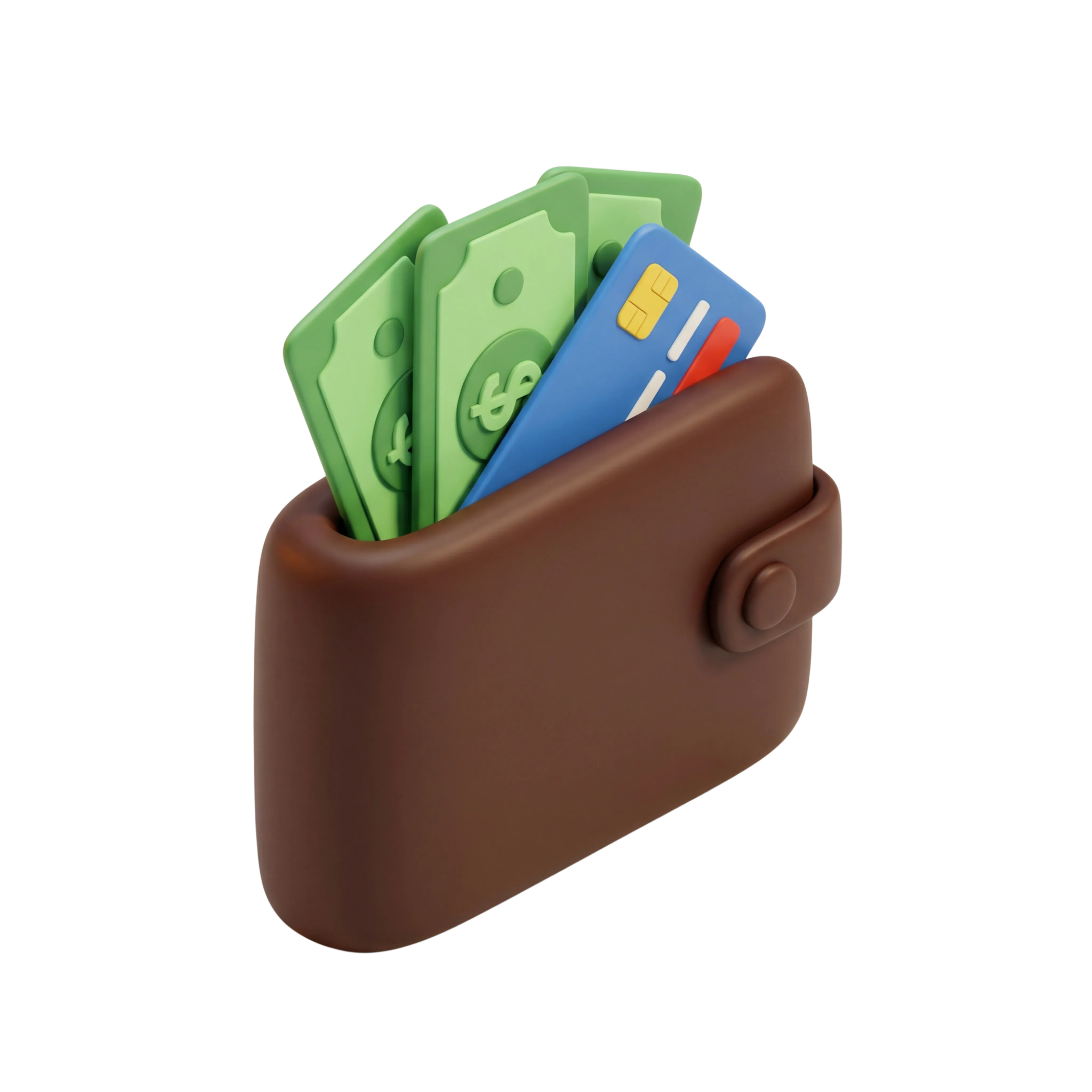 أيقونة ثلاثية الأبعاد لمحفظة تحتوي على نقود وبطاقات ائتمان