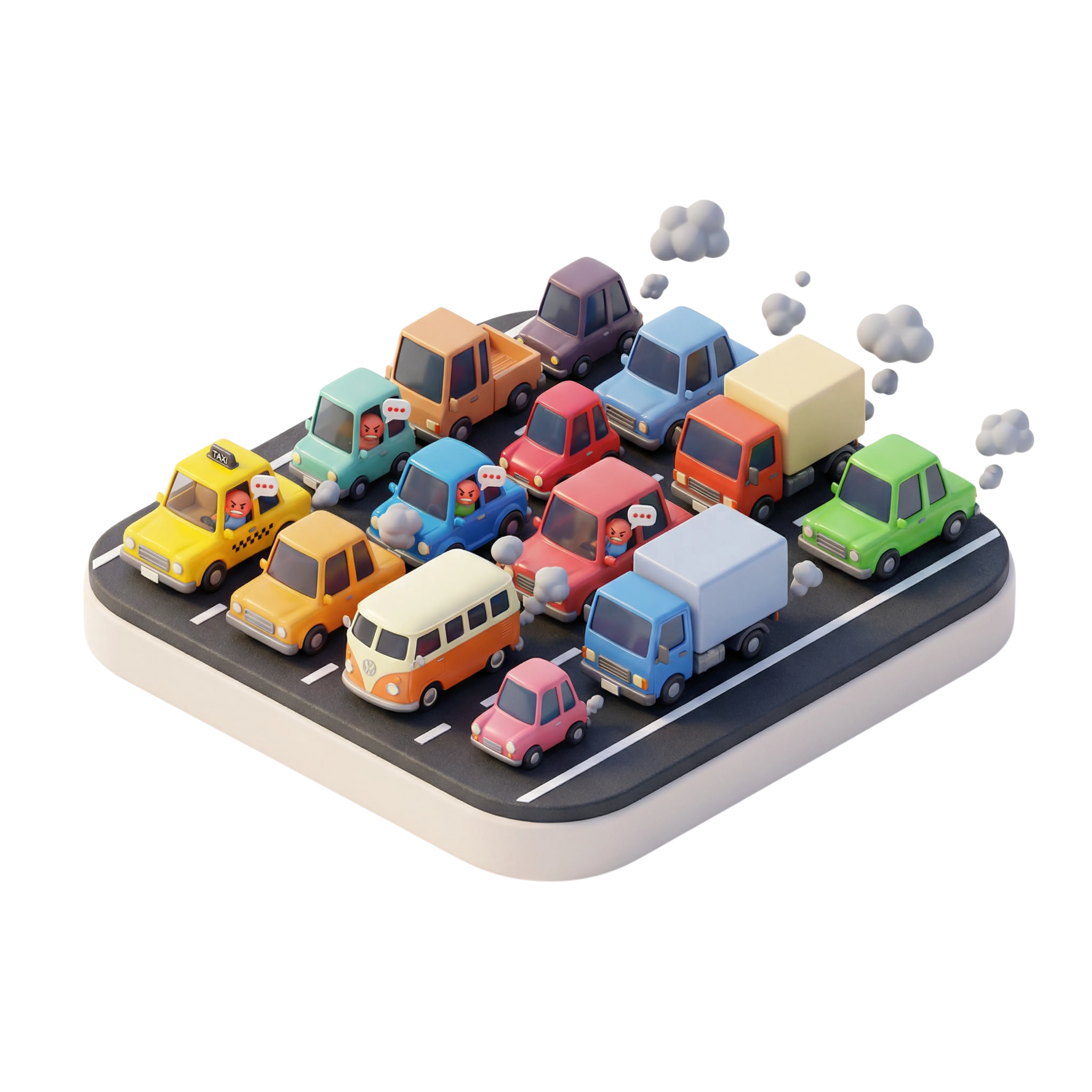 أيقونة ثلاثية الأبعاد عالية الجودة تُظهر مشهد ازدحام مروري بأسلوب كرتوني وألوان زاهية. السيارات بتشطيب بلاستيكي غير لامع وتتميز بتعابير وجه وشخصيات داخلها، مما يجعلها مثالية لتطبيقات الجوال أو تصاميم الواجهات المتعلقة بالنقل والبنية التحتية.