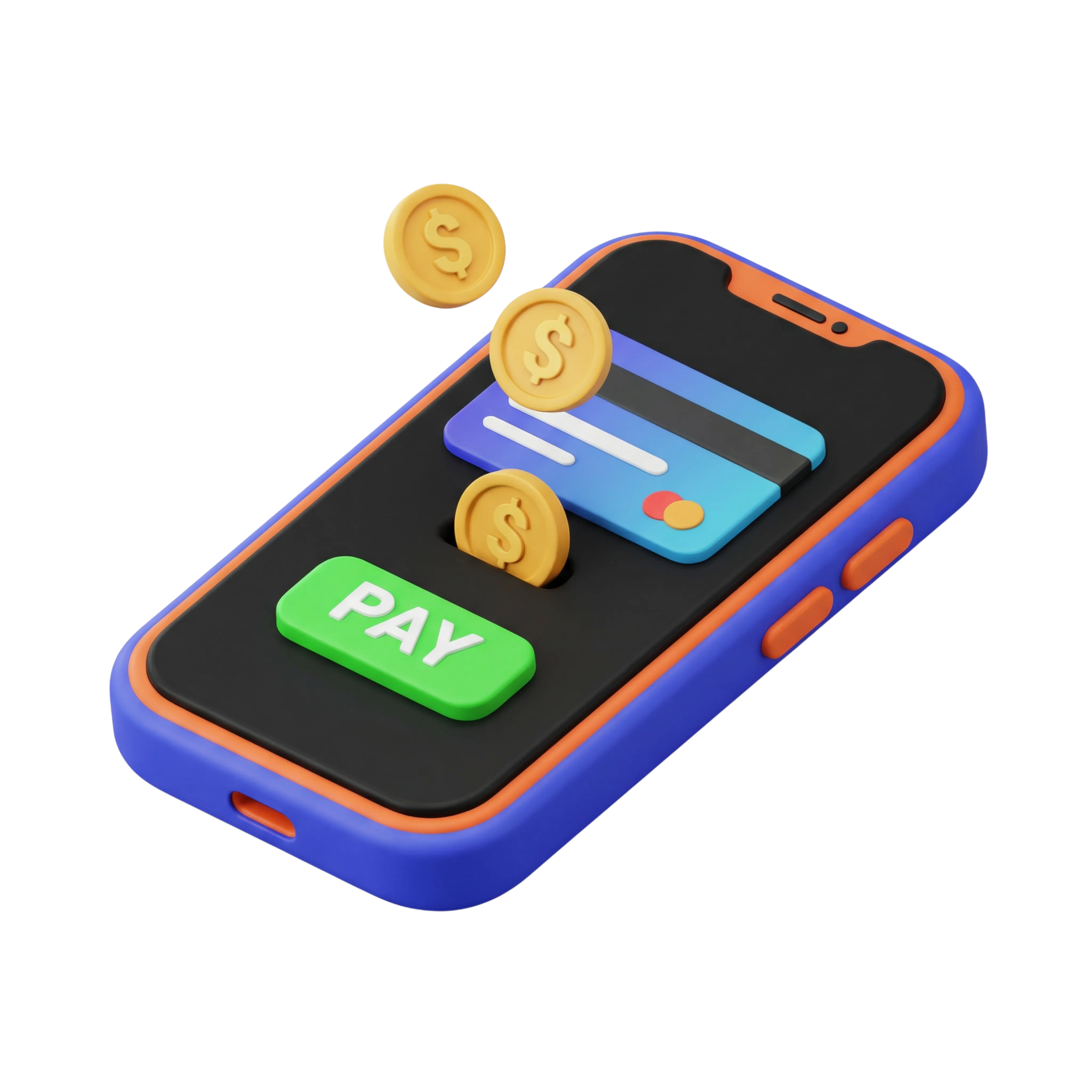 مجسم ثلاثي الأبعاد لهاتف ذكي بتصميم مميز يُظهر زر 'Pay' أخضر بارز وبطاقة ائتمان وأيضًا عملات ذهبية طائرة. يتميز العمل بملمس غير لامع وألوان زاهية، ما يجعله مناسبًا لتطبيقات التكنولوجيا المالية وتصاميم واجهات المستخدم.