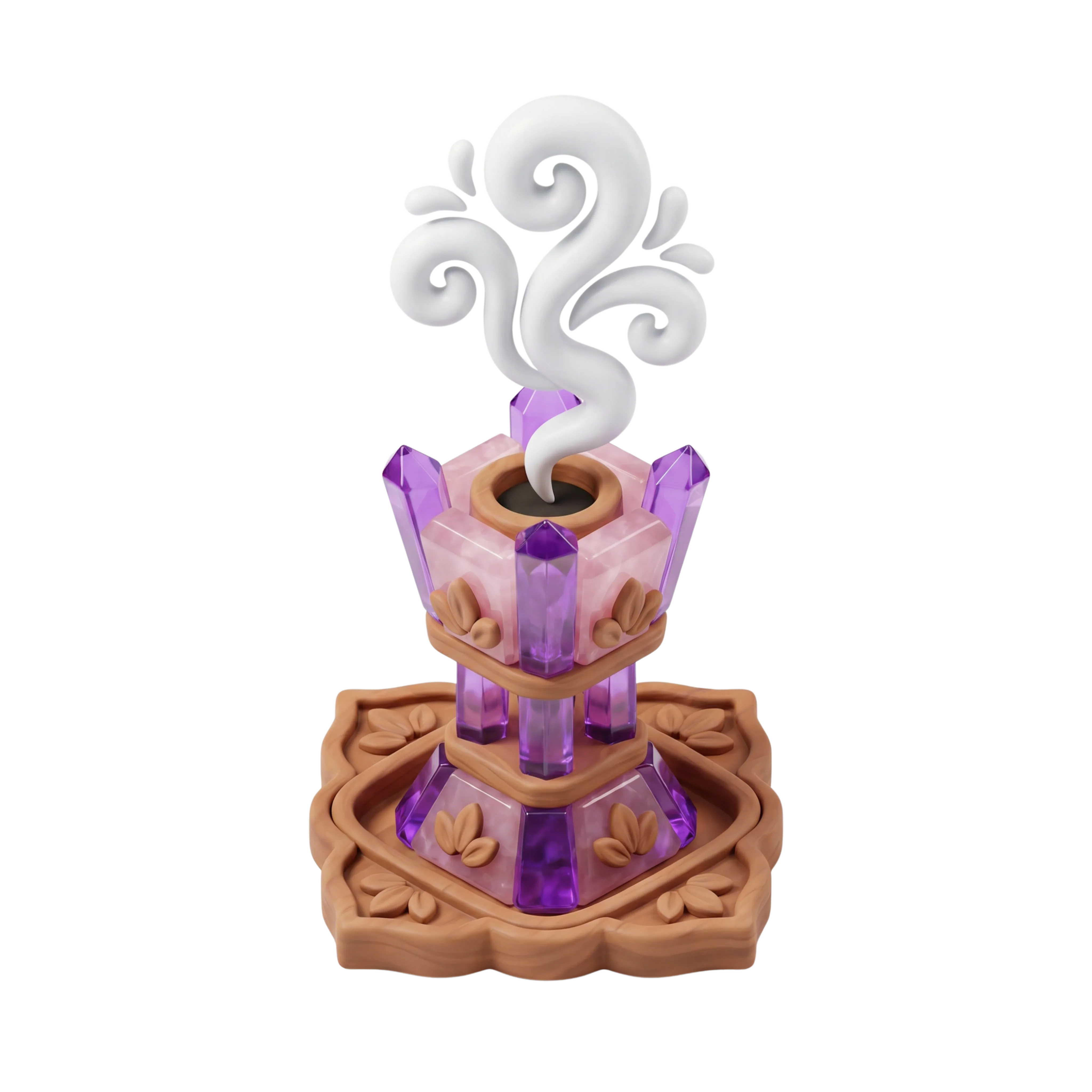 مجسم ثلاثي الأبعاد لمبخرة خليجية بتصميم فني، مزينة بأعمدة كريستالية لامعة باللون البنفسجي وقاعدة فخارية مطفية، ينبعث منها دخان عطري أبيض بشكل زخرفي. مثالية لاستخدامات التصميم الداخلي والمشاهد الثقافية أو الاحتفالية.