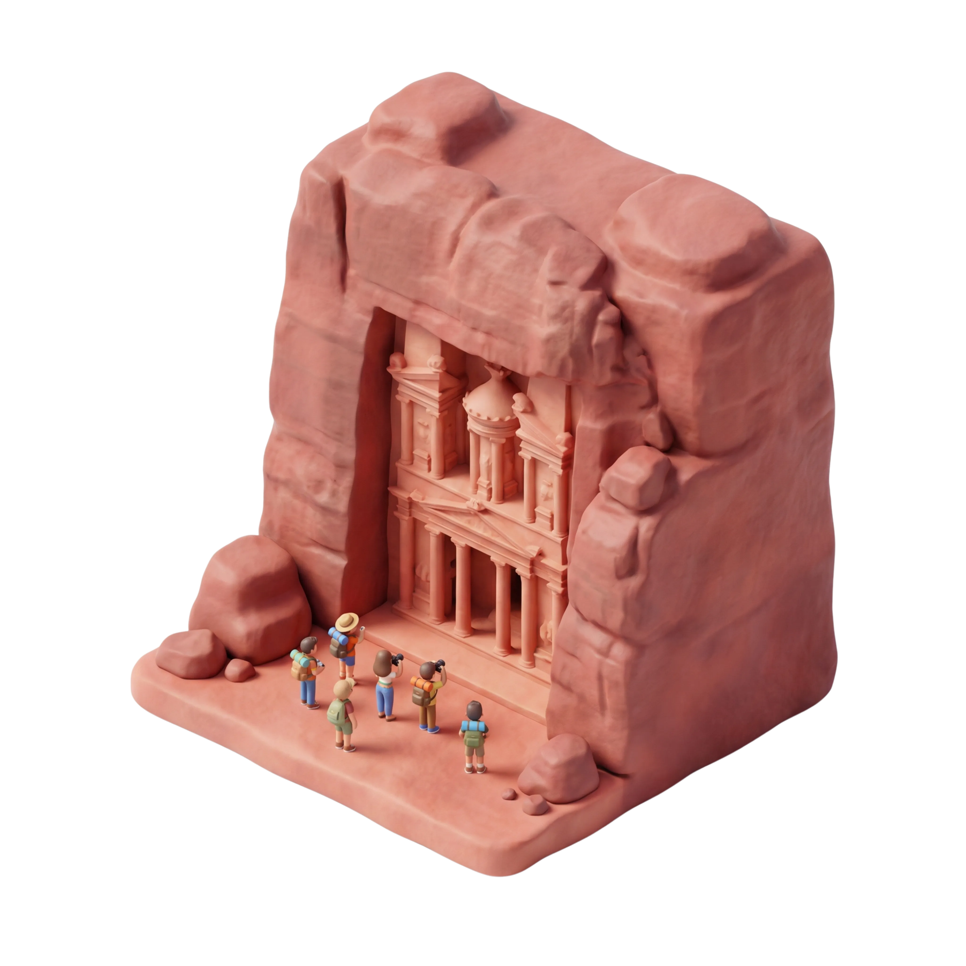 A detailed 3D render of Al-Khazneh (The Treasury) in Petra, Jordan, sculpted from pink-hued matte sandstone with stylized miniature tourists. This asset is ideal for educational, cultural, or tourism-related visualizations and marketing materials.
