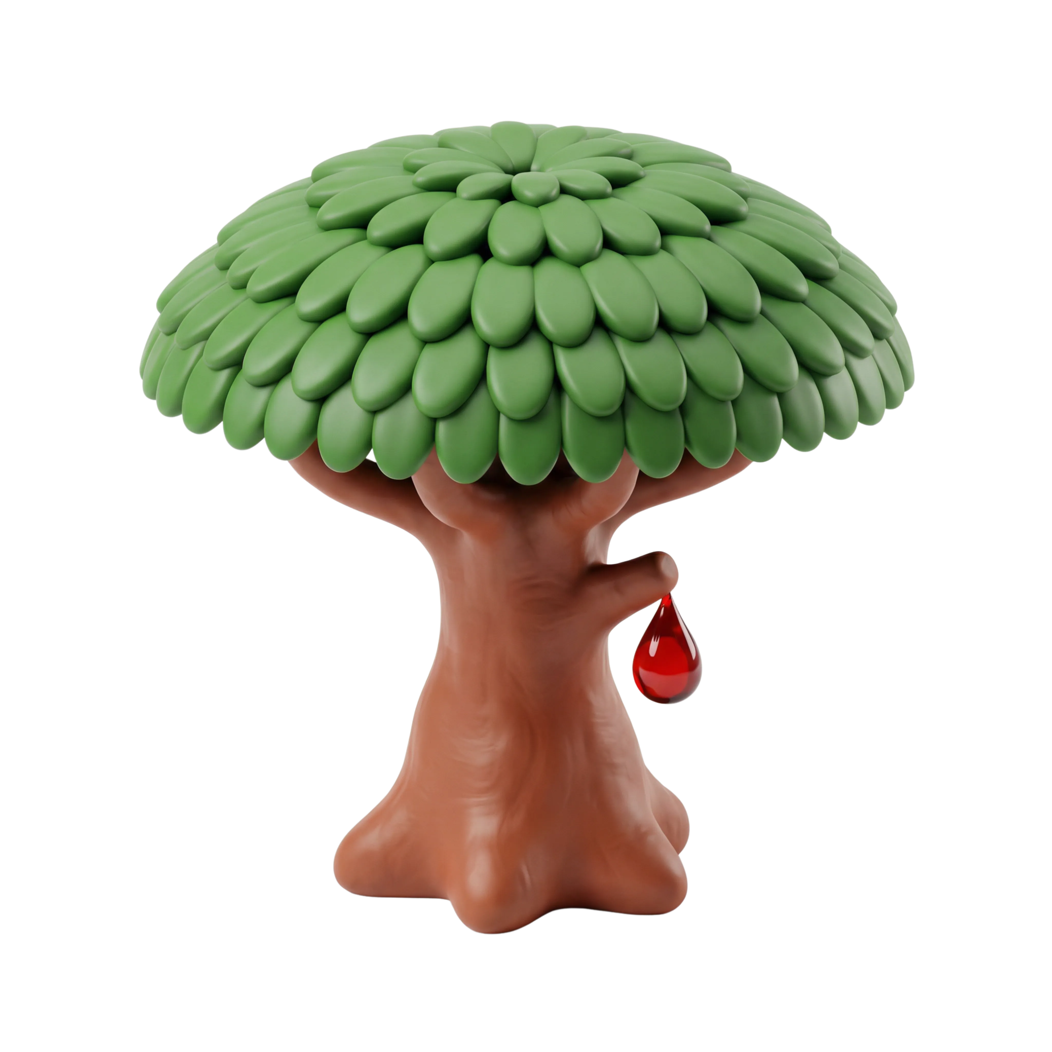 A high-quality 3D render of the Dragon Blood Tree, native to Socotra, Yemen. The tree features a stylized matte-finish trunk and a glossy green canopy composed of layered oval leaves. A droplet of red resin symbolizes the tree's famed medicinal sap. Ideal for cultural, environmental, and educational visual content.