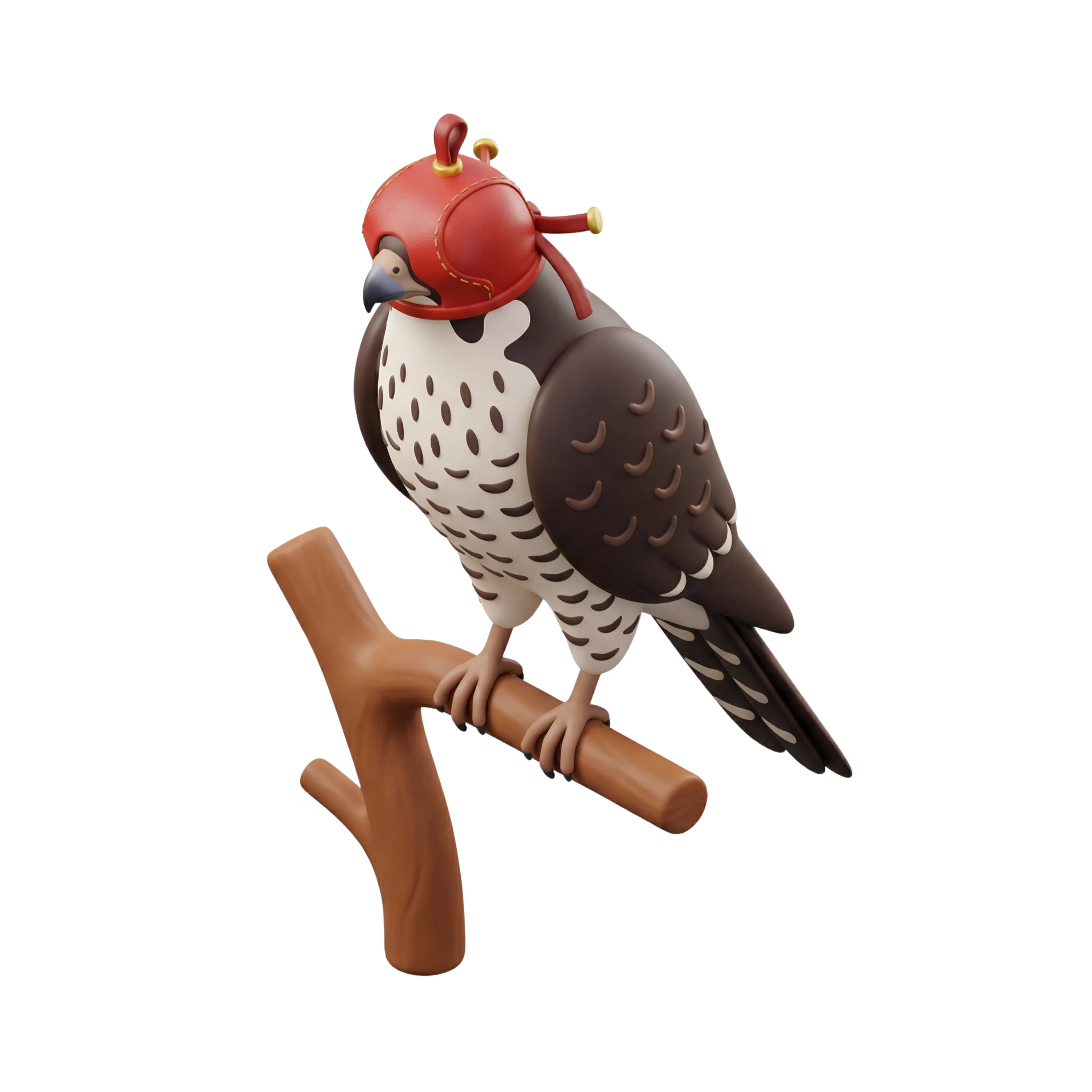 مجسم ثلاثي الأبعاد مفصل لصقر واقف على قاعدة خشبية، يرتدي برقع الصقارة التقليدي. يتميز بخامة غير لامعة تُضفي طابعًا عصريًا بسيطًا مع الحفاظ على الأصالة الثقافية. مناسب لتطبيقات ثقافية، ورسوم متحركة، ومشاريع تراثية خليجية.
