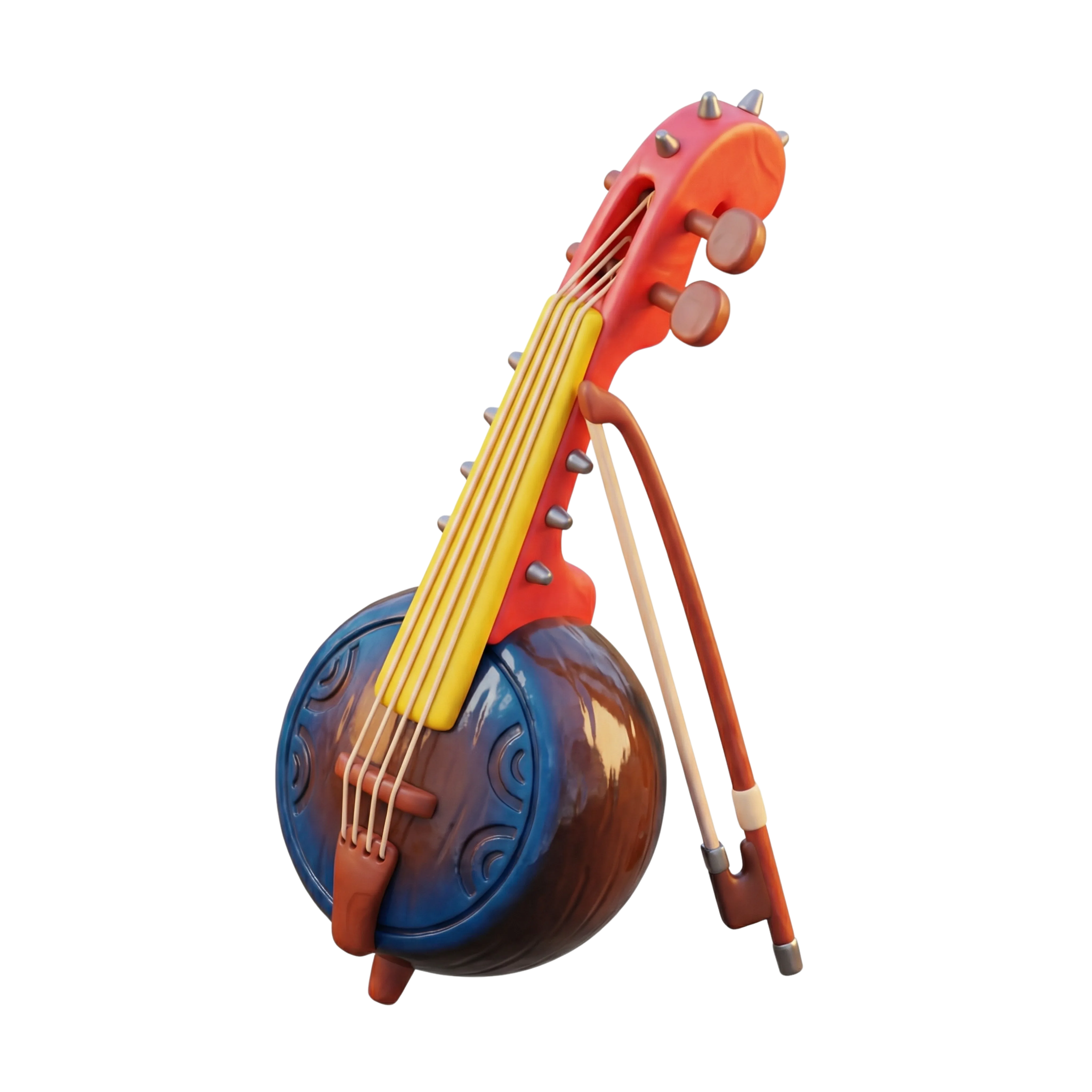 A detailed 3D render of a traditional Joza fiddle, commonly used in Iraqi and Middle Eastern music. The model features a glossy, polished wood finish, complete with tuning pegs, strings, and a curved bow. Ideal for cultural visualizations, music-themed designs, and educational content.