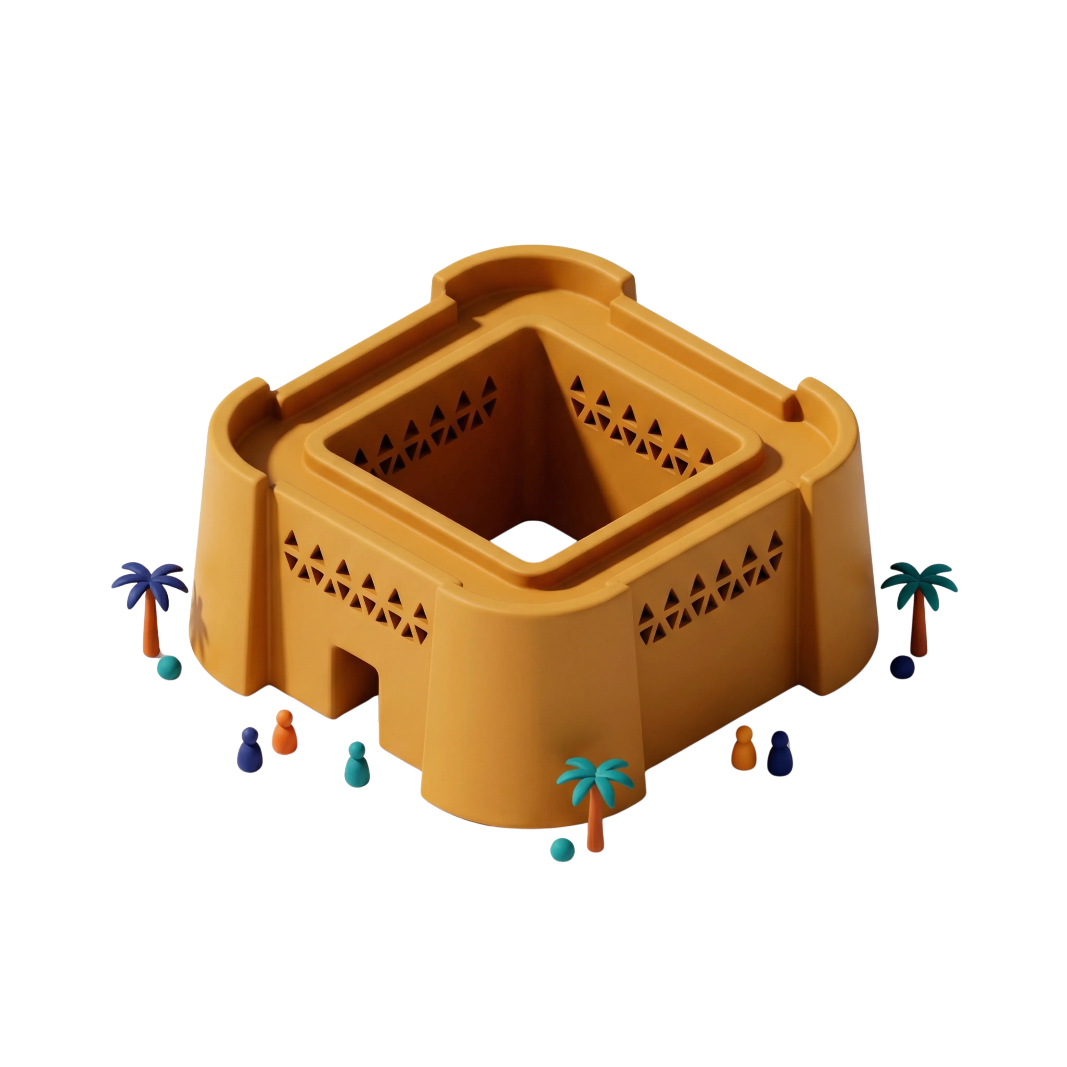 مجسم ثلاثي الأبعاد بأسلوب تجريدي لحصن المصمك التاريخي بملمس طيني غير لامع وتفاصيل معمارية مبسطة. محاط بأشجار نخيل وشخصيات مصغرة، ويُعد مناسبًا للمحتوى الرقمي التعليمي والثقافي والسياحي.