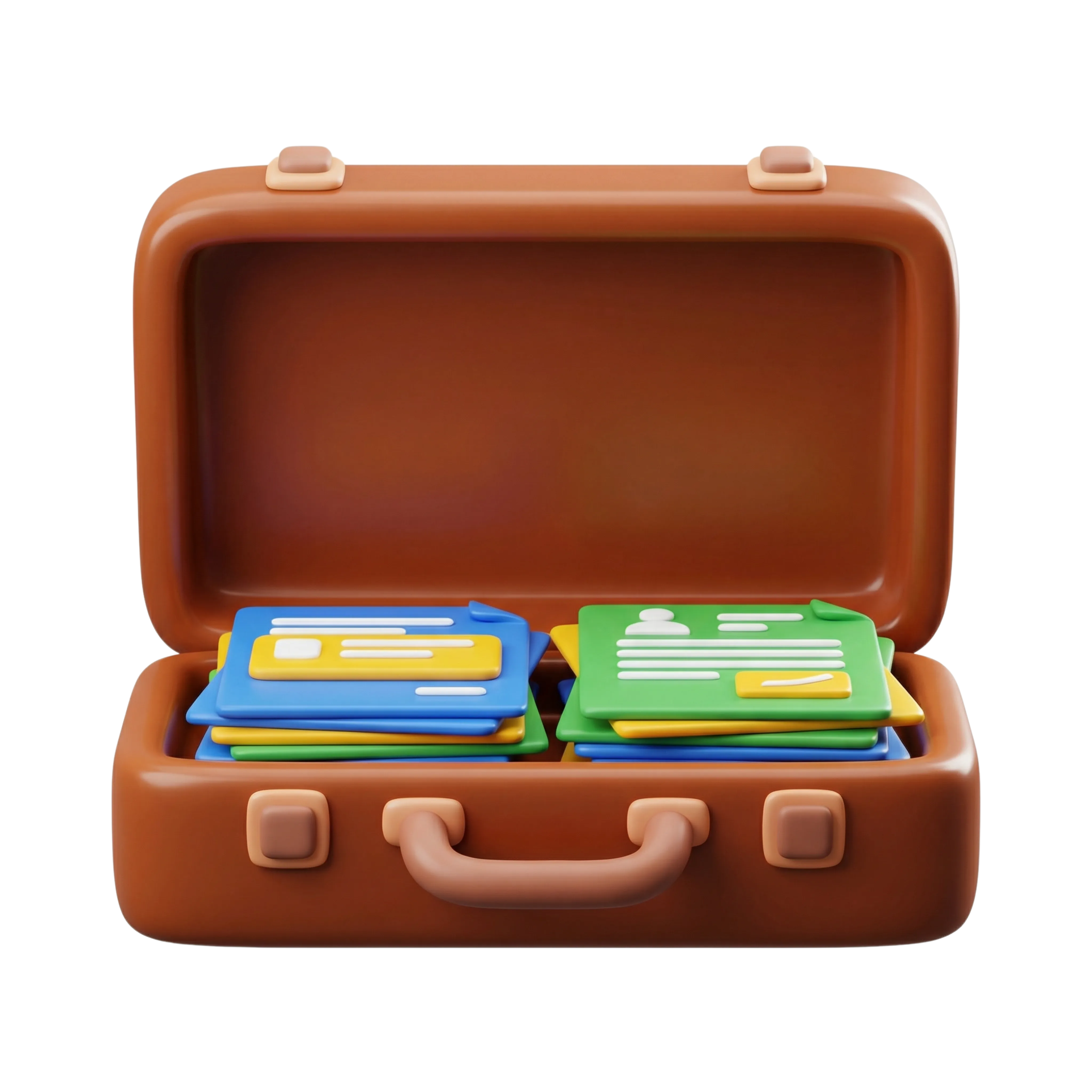 A detailed 3D render of a matte-finished brown open briefcase filled with stylized, colorful document icons. The playful design and smooth textures make it ideal for UI/UX mockups, office-themed visuals, productivity apps, or educational content.