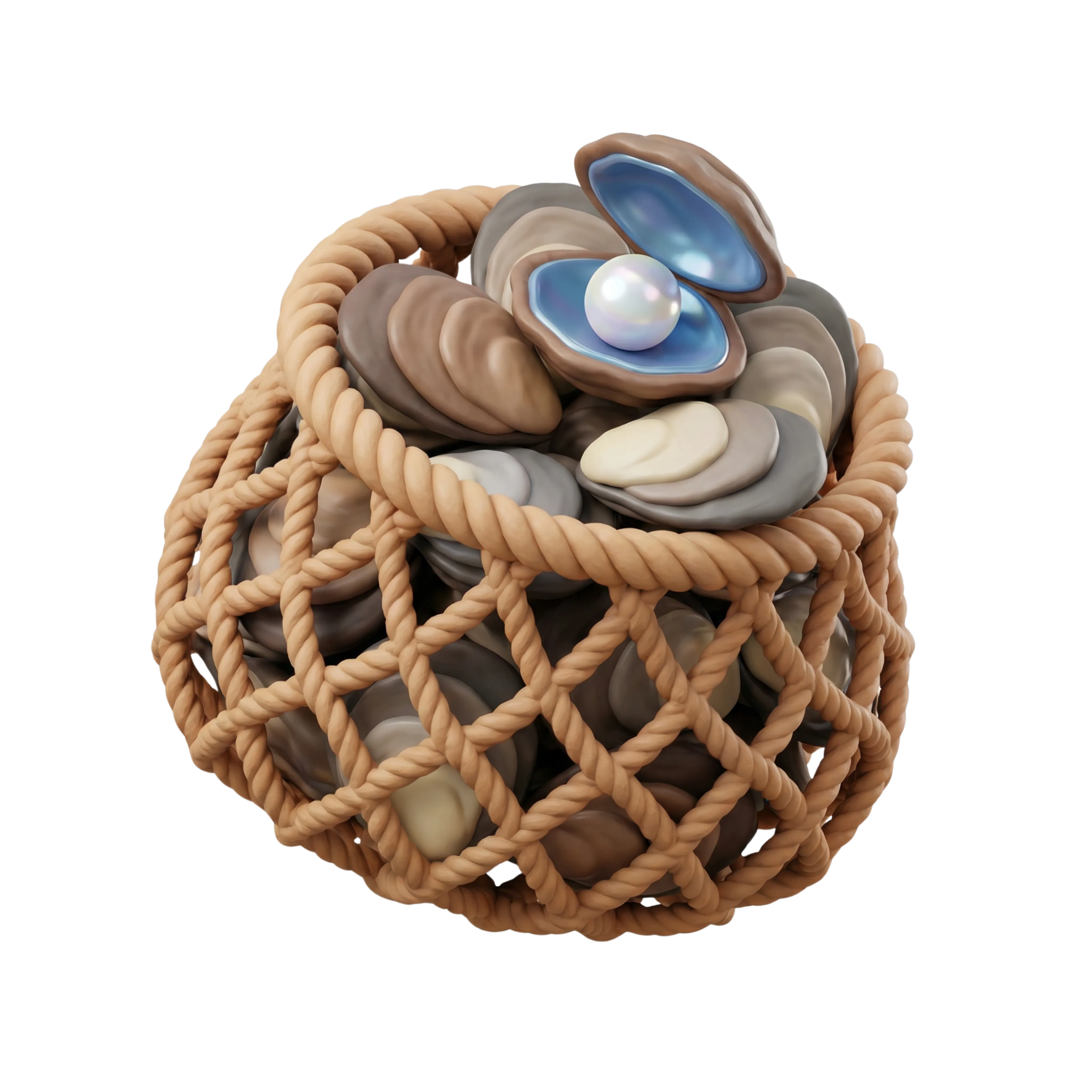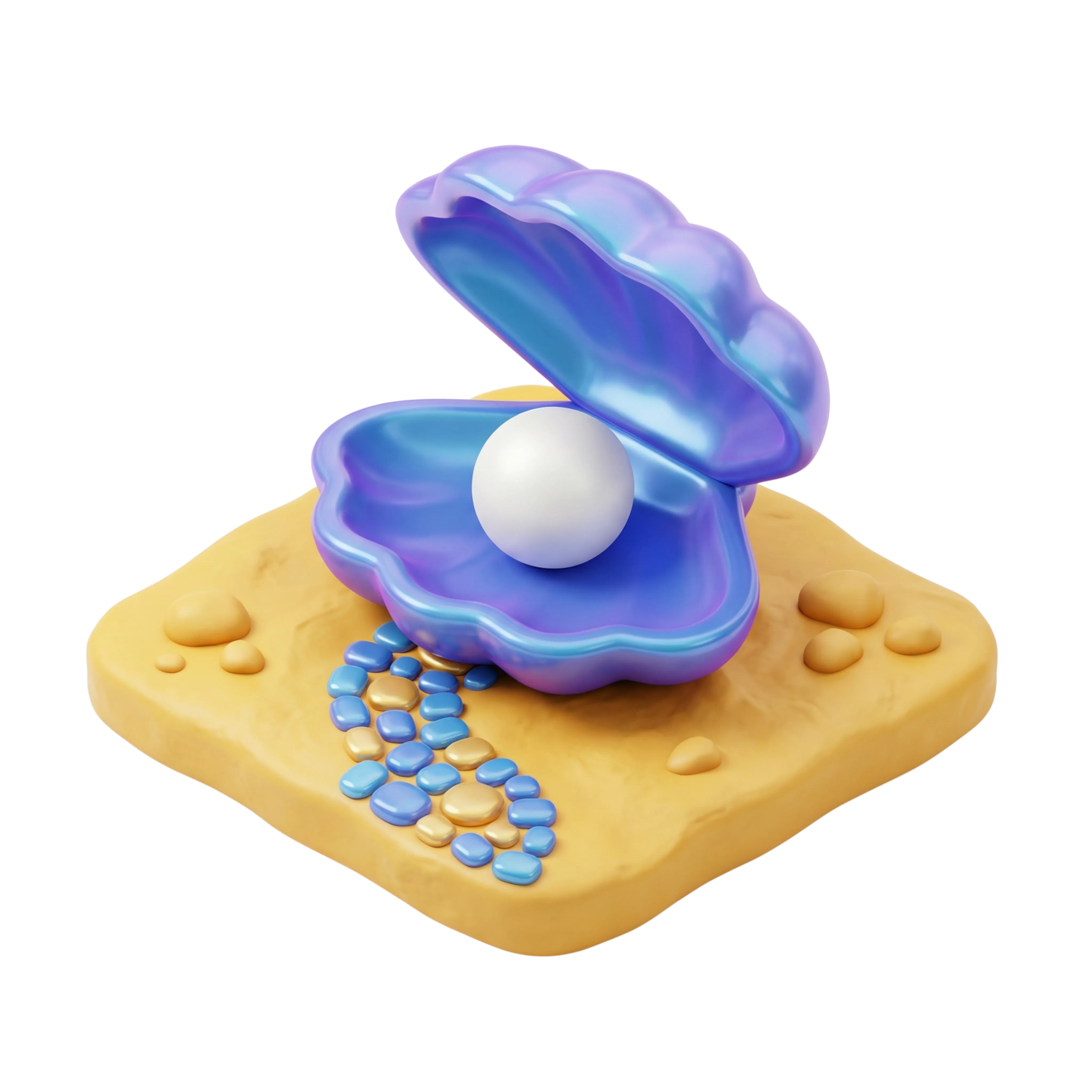 مجسم ثلاثي الأبعاد عالي الجودة للؤلؤة داخل صدفة لامعة بألوان بنفسجية وزرقاء متدرجة، موضوعة على قاعدة رملية مزخرفة. الؤلؤة ناعمة ولامعة مما يجعلها مناسبة للتصاميم الثقافية، والمحتوى البحري، والأيقونات الرسومية أو المواد التعليمية عن تراث الغوص على اللؤلؤ.