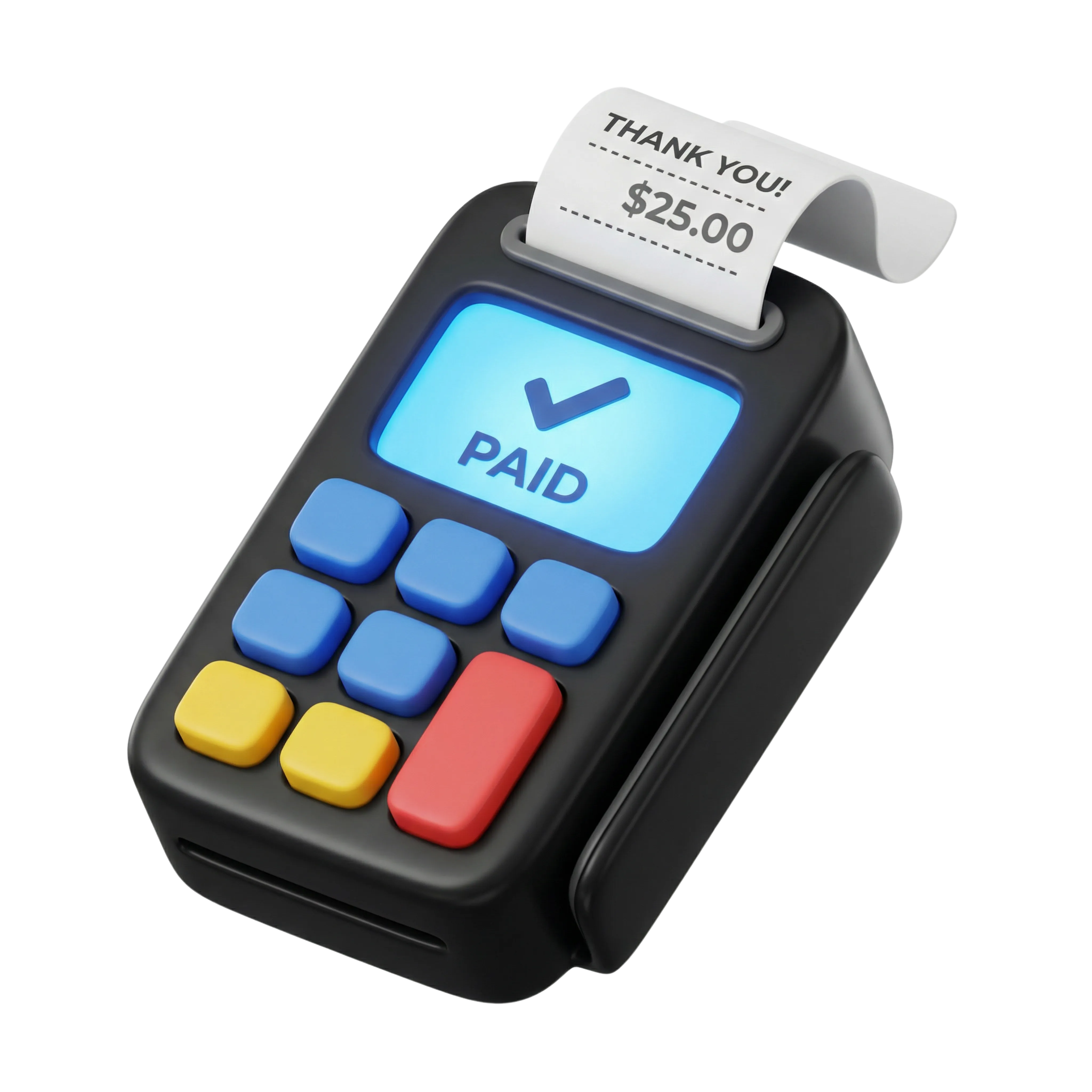 مجسم ثلاثي الأبعاد أنيق لجهاز نقاط بيع (POS) مصنوع من البلاستيك غير اللامع، يحتوي على أزرار ملونة وشاشة مضيئة تُظهر إتمام عملية الدفع بكلمة 'PAID'. يشمل أيضًا إيصالًا مطبوعًا بمبلغ 25 دولارًا، وهو مثالي لتصميمات التجارة الإلكترونية، واجهات أنظمة الدفع، ومحتوى التسويق المالي.