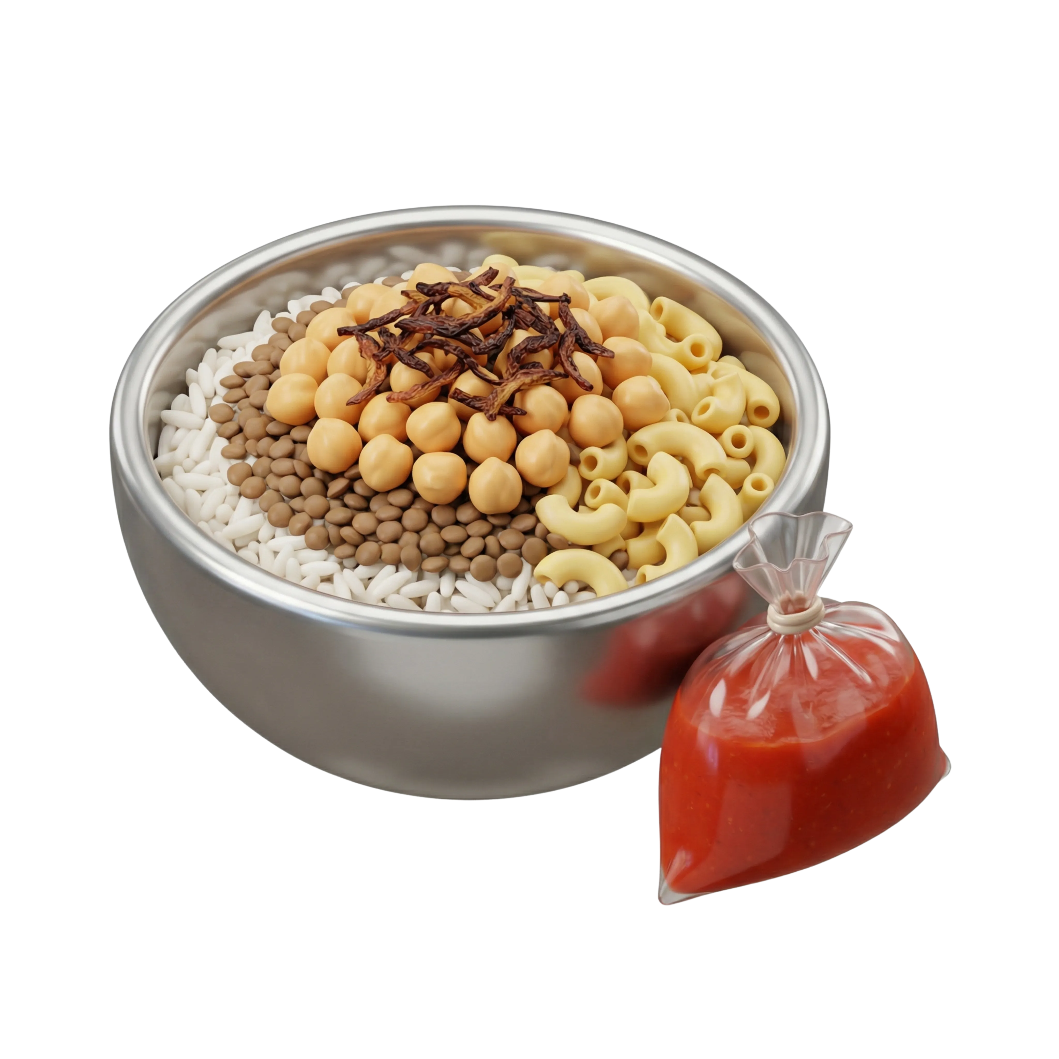 مجسم ثلاثي الأبعاد واقعي لطبق كشري مصري تقليدي بملمس غير لامع وتفاصيل دقيقة لمكونات الطعام. يحتوي النموذج على الأرز والعدس والمكرونة والحمص والبصل المحمر مع كيس صلصة الطماطم. مثالي لتصاميم رقمية تتعلق بالطعام أو قوائم المطاعم أو العروض الثقافية.