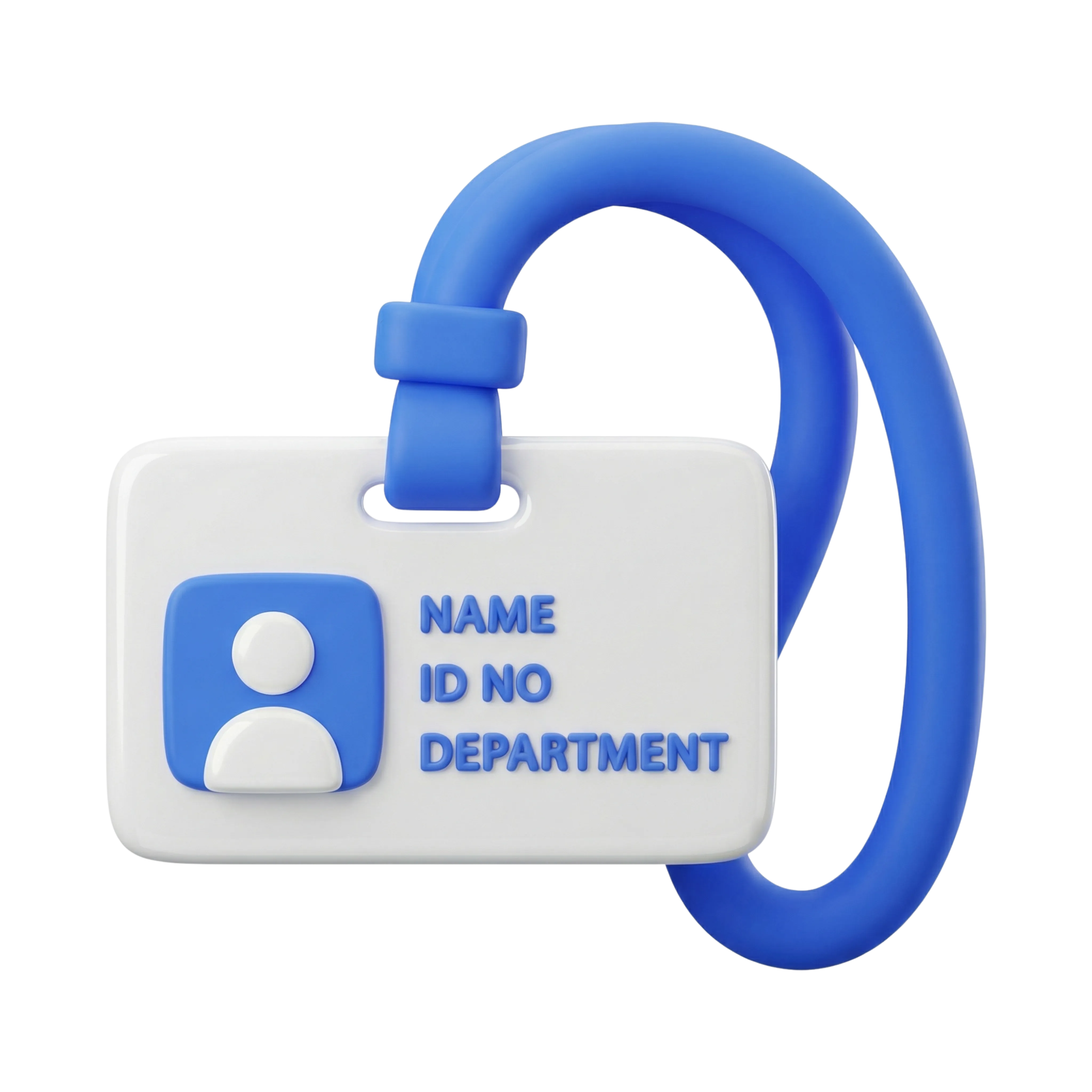 مجسم ثلاثي الأبعاد عالي الجودة لبطاقة تعريف متصلة بحبل منحني. تتميز البطاقة بسطح بلاستيكي لامع مع تفاصيل بارزة تتضمن رمز مستخدم ونصًا تمهيديًا للاسم ورقم التعريف والقسم. مناسب للاستخدام في بيئات العمل أو الفعاليات أو تصاميم واجهات الاستخدام الرقمية.
