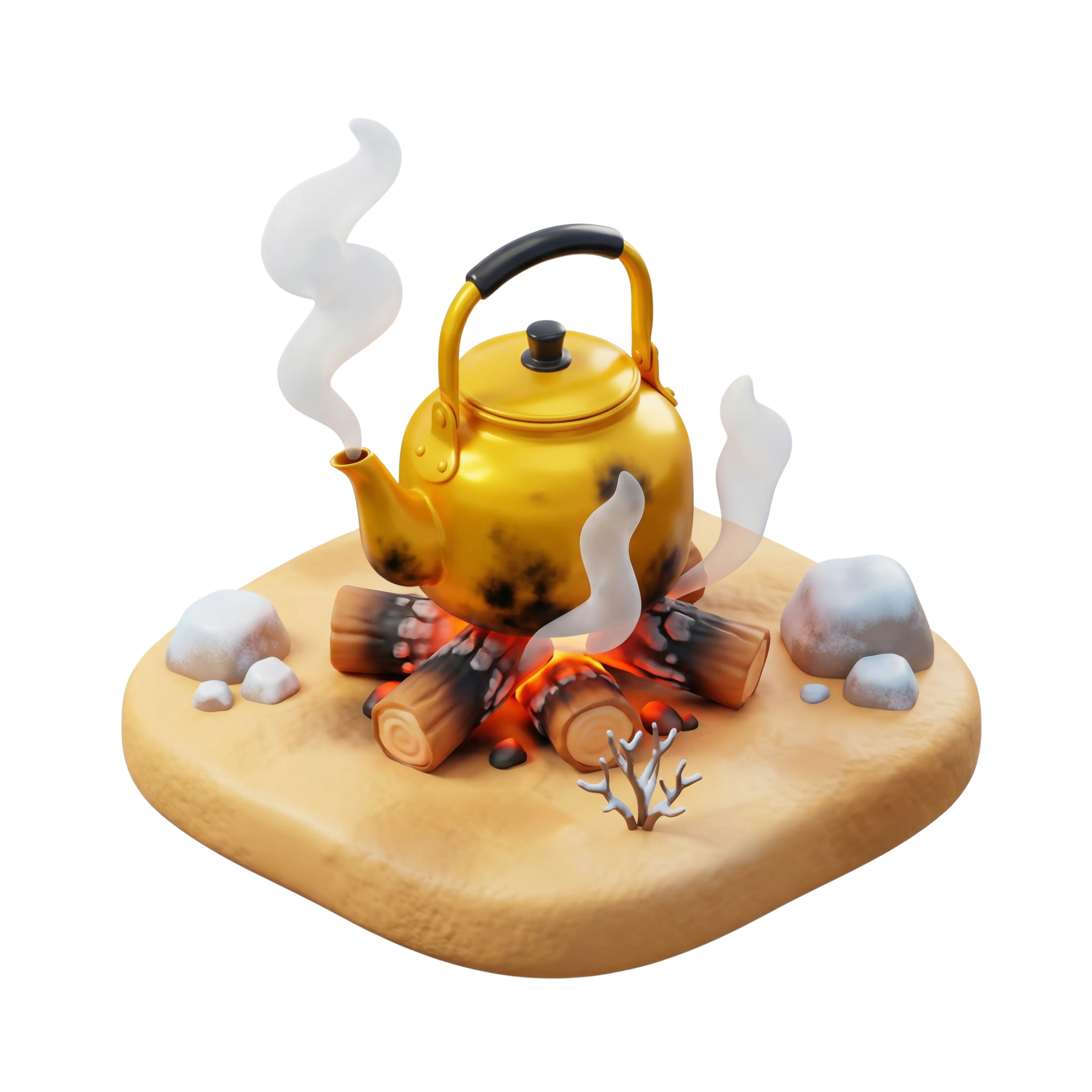 مجسم ثلاثي الأبعاد لإبريق ذهبي على نار مخيم