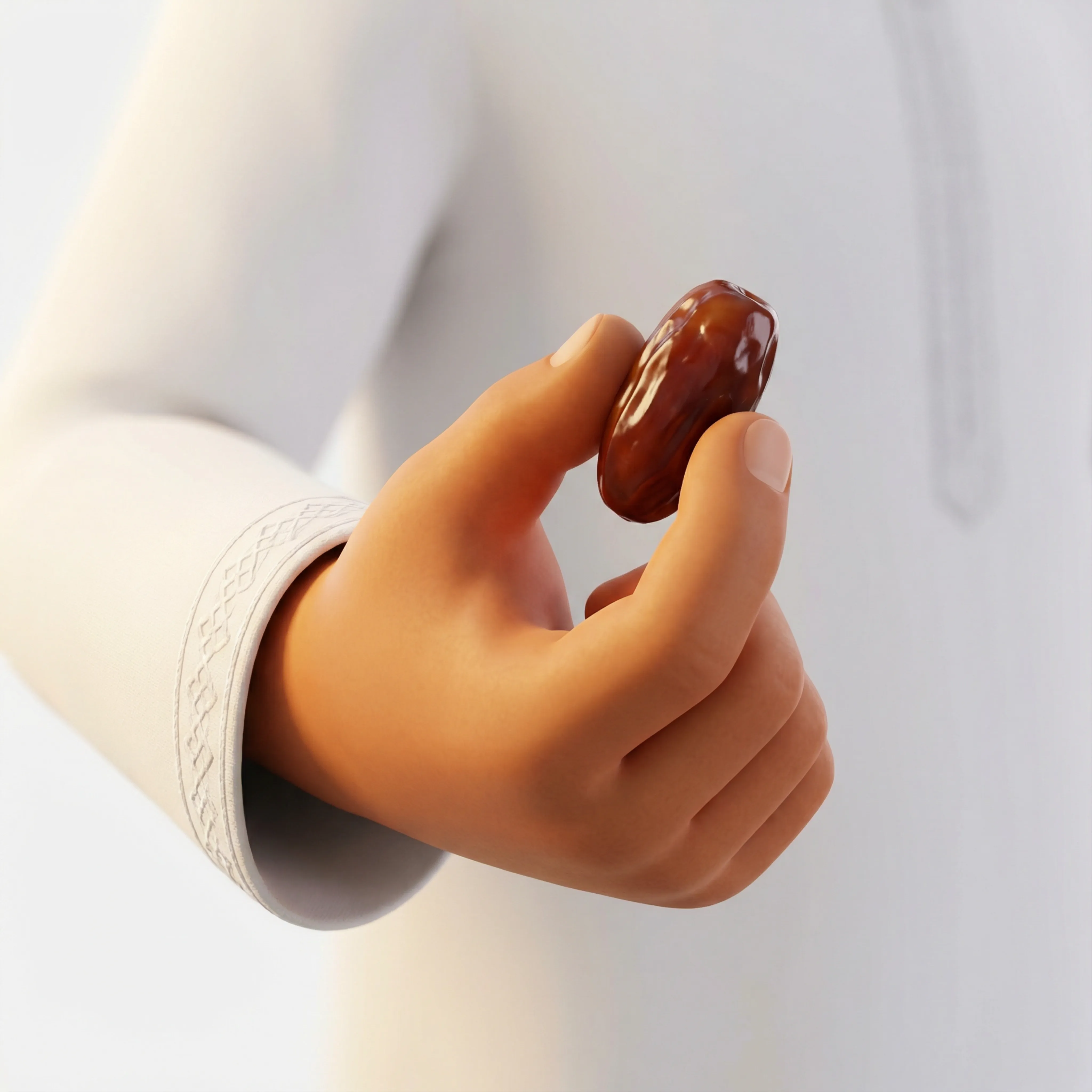 مجسم ثلاثي الأبعاد عالي الجودة ليد ترتدي الزي التقليدي السعودي تمسك بحبة تمر لامعة. يعكس أهمية التمر في الثقافة، مناسب لتصاميم رمضان، الإعلانات الثقافية، والمجالات الغذائية.