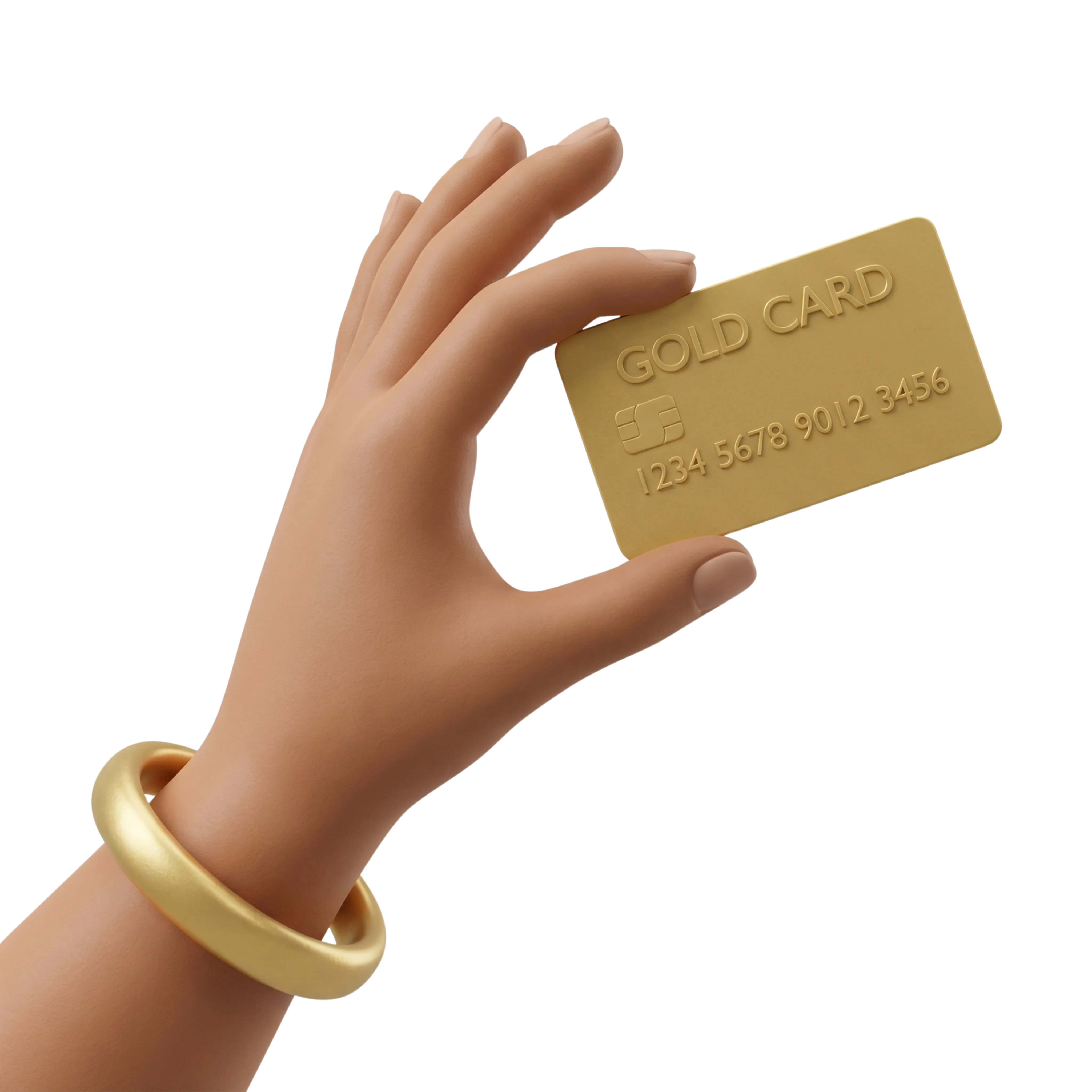 نموذج ثلاثي الأبعاد عالي الجودة ليد بشرية بأسلوب كرتوني تحمل بطاقة ائتمان ذهبية غير لامعة. تحتوي البطاقة على أرقام ونص بارزين كتب عليه 'GOLD CARD'، ما يمنحها مظهراً فاخراً وحصرياً. ترتدي اليد أيضاً سواراً ذهبياً معدنياً ناعماً، مما يعزز الإحساس بالأناقة. مناسب لتطبيقات البنوك، واجهة المستخدم المالية، تصاميم التكنولوجيا المالية، أو الرسومات الترويجية للخدمات الراقية.