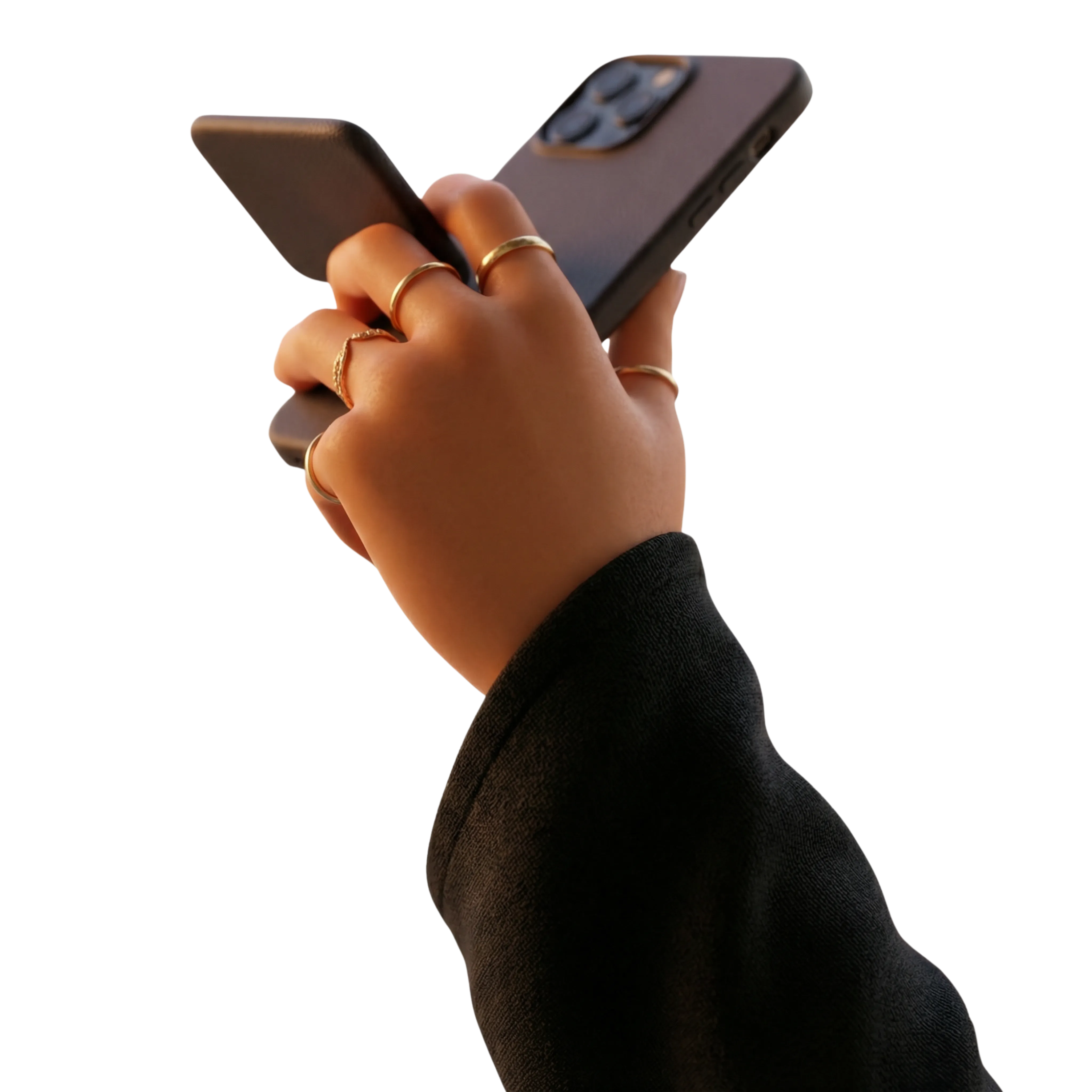 مجسم ثلاثي الأبعاد دقيق ليد بشرية مزينة بخواتم ذهبية تمسك بهاتف ذكي أسود بملمس غير لامع وحامل بطاقات قابل للطي. المجسم يظهر تفاصيل واقعية في خامة القماش والإضاءة الدافئة، ومناسب لتصاميم التكنولوجيا، ومعاينات تجربة المستخدم، ومنتجات التقنية المالية.