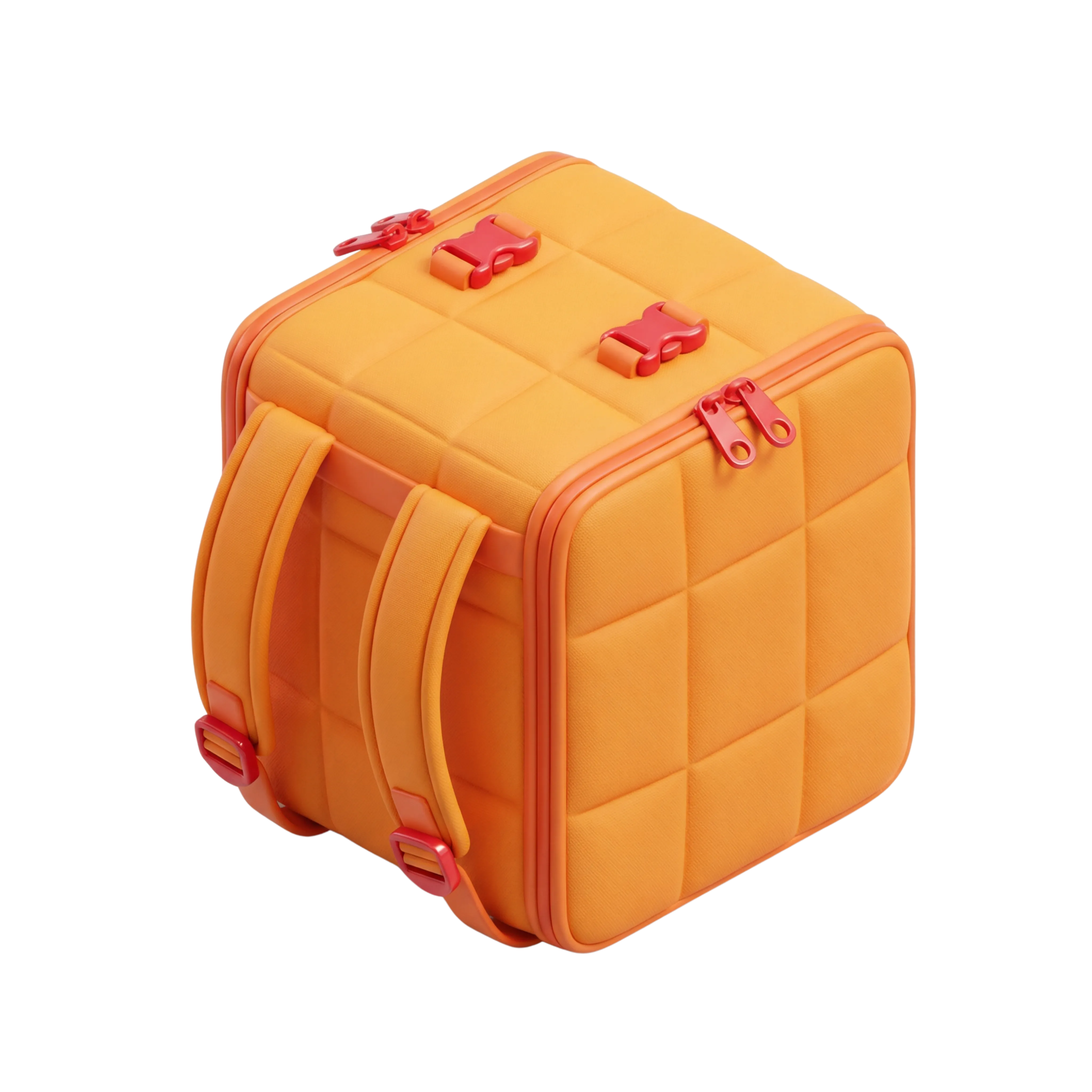 مجسم ثلاثي الأبعاد عالي الجودة لحقيبة توصيل معزولة، بتصميم من قماش مبطن غير لامع ولون برتقالي زاهي. تحتوي على أحزمة كتف مريحة وإبزيمات بلاستيكية حمراء، مثالية لاستخدامات خدمات التوصيل وتصاميم التطبيقات المتعلقة بالخدمات اللوجستية.