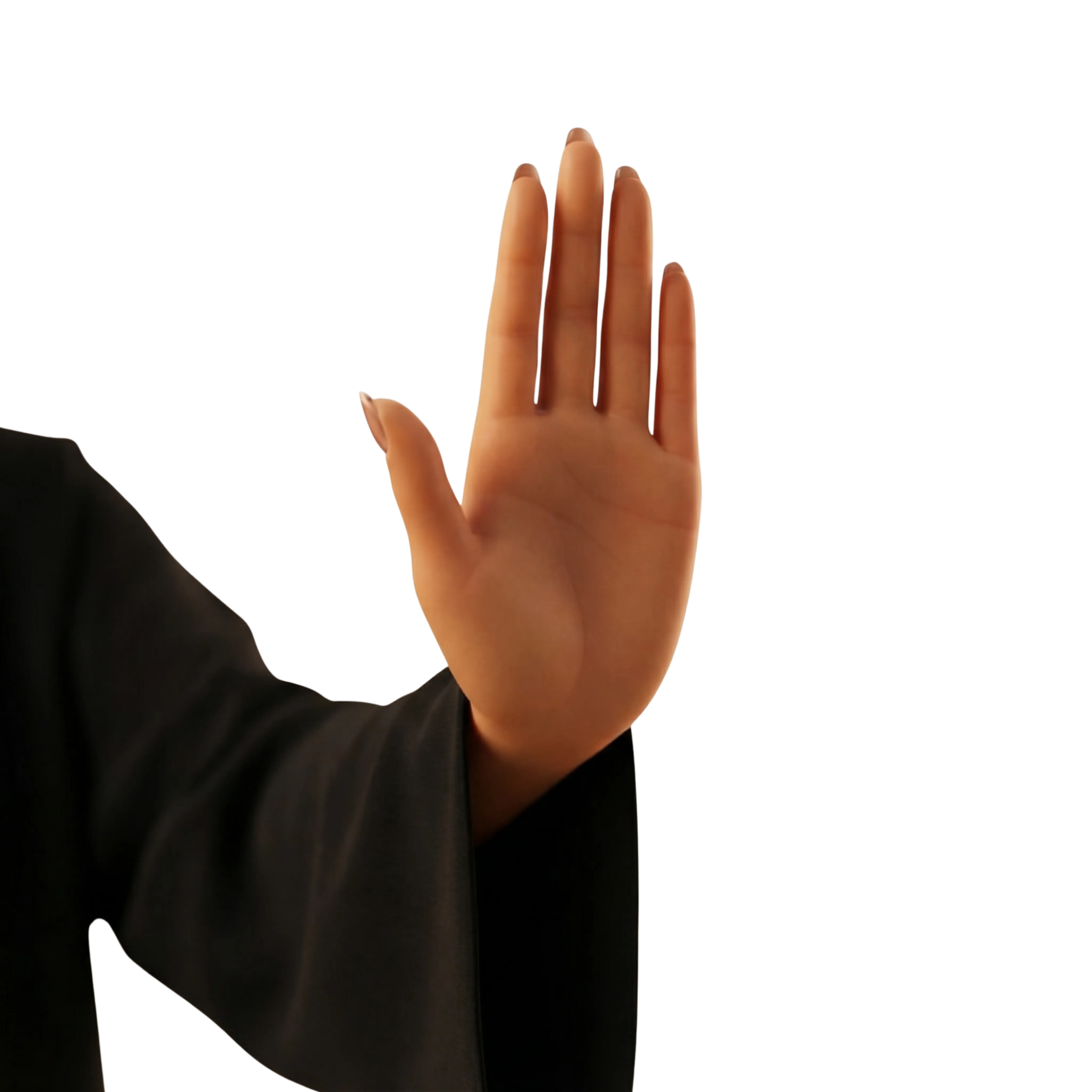 مجسم ثلاثي الأبعاد عالي الجودة ليد مرفوعة تقوم بإشارة التوقف، بملمس بشرة غير لامع وتصميم كم عباءة سوداء تقليدية. مثالي لحملات التوعية الاجتماعية، وأيقونات الإيماءات، والتصاميم ذات الطابع الثقافي الشرق أوسطي.