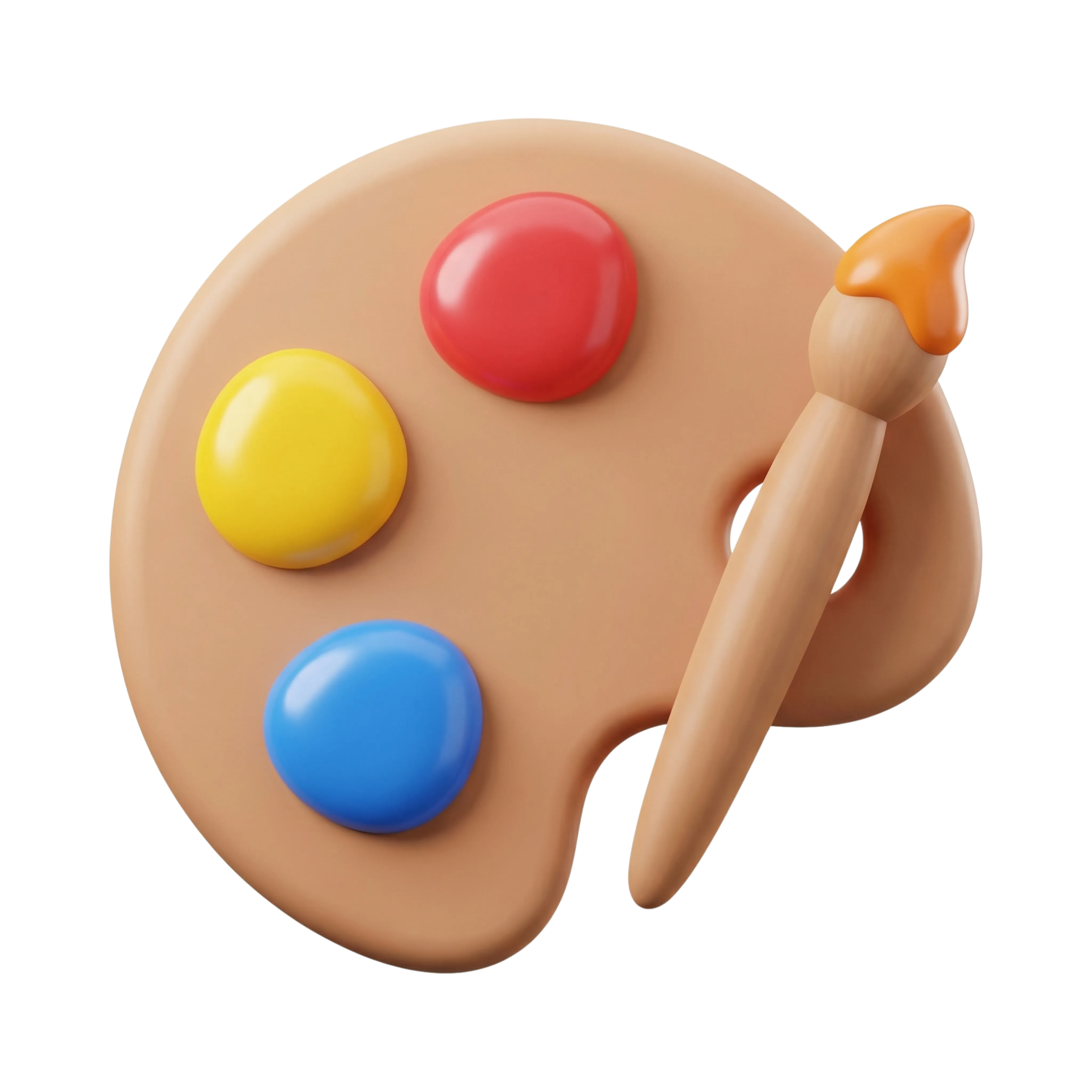 أيقونة ثلاثية الأبعاد عالية الجودة تُظهر لوحة ألوان فنية تحتوي على ثلاث قطرات طلاء لامعة بألوان الأحمر والأصفر والأزرق، مع فرشاة مرسومة بأسلوب ناعم. تتميز اللوحة بخامة شبه مطفية، مما يجعلها مثالية لتصميمات الواجهات أو الاستخدامات التعليمية أو الهويات البصرية الإبداعية.
