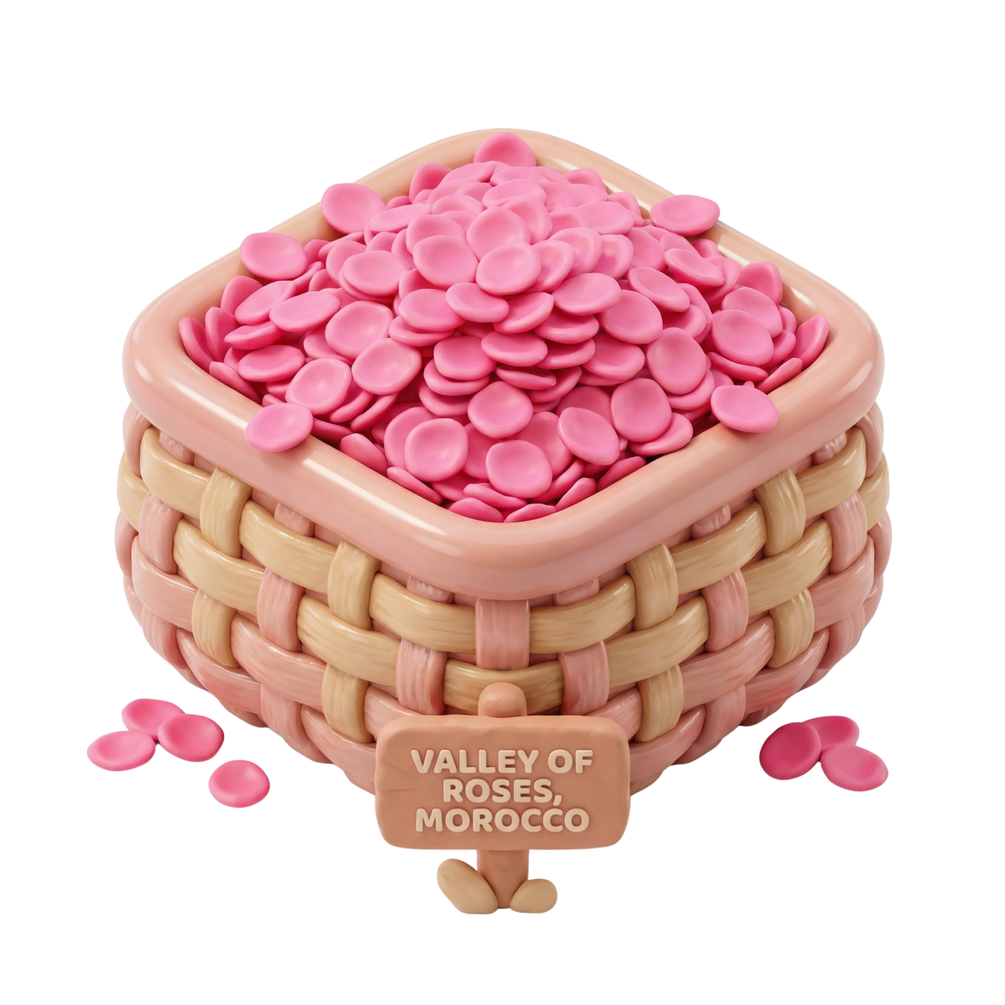 مجسم ثلاثي الأبعاد عالي الجودة لسلة تقليدية منسوجة مملوءة ببتلات ورد وردية لامعة، في إشارة إلى وادي الورود الشهير في المغرب. مثالي للمشروعات الثقافية، والمواضيع النباتية، أو الاستخدام في التصاميم الرقمية التزيينية.