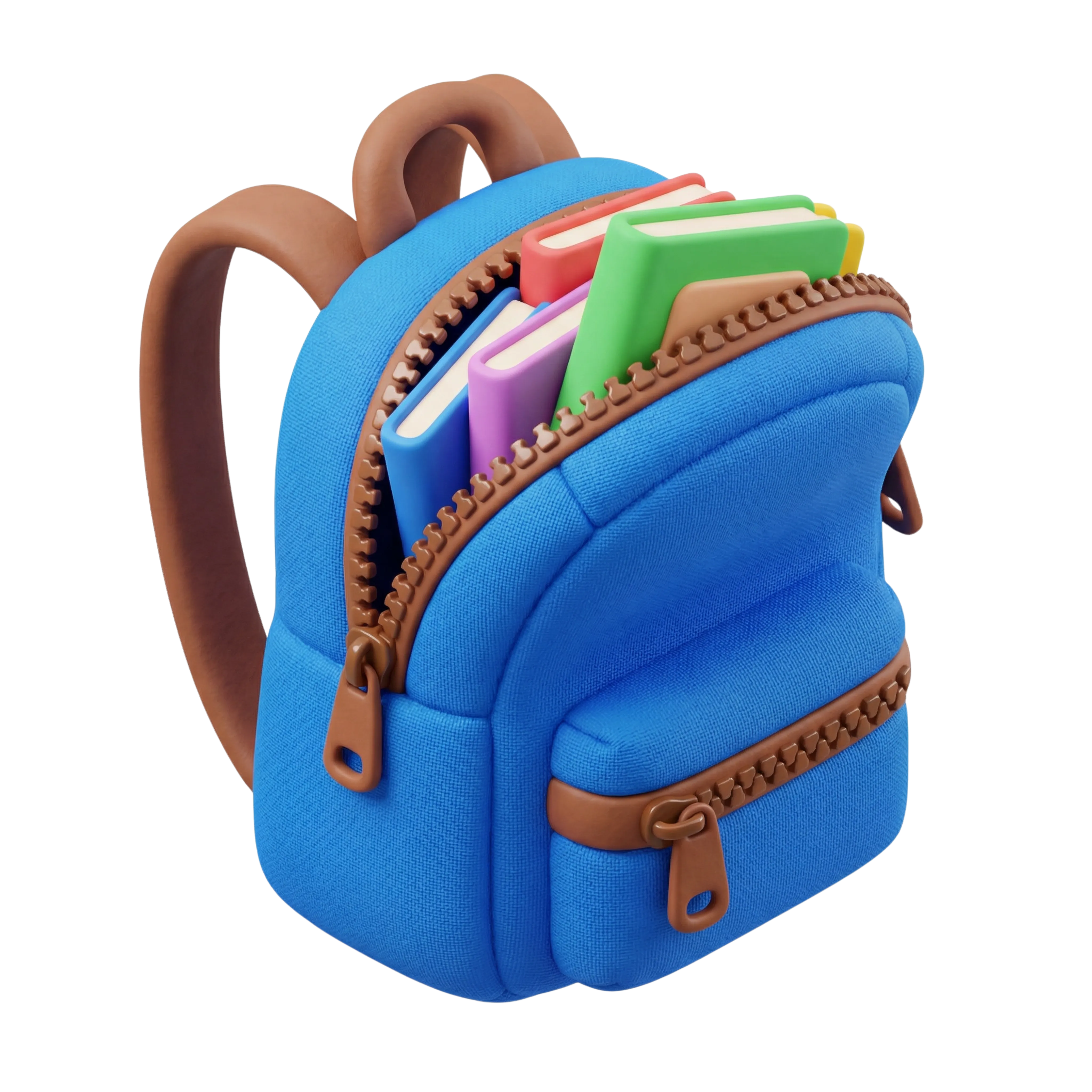 A high-quality 3D model of a matte blue school backpack with soft brown straps and zippers, shown open and filled with several colorful books. Ideal for educational content, school-themed graphics, and UI elements for learning apps.