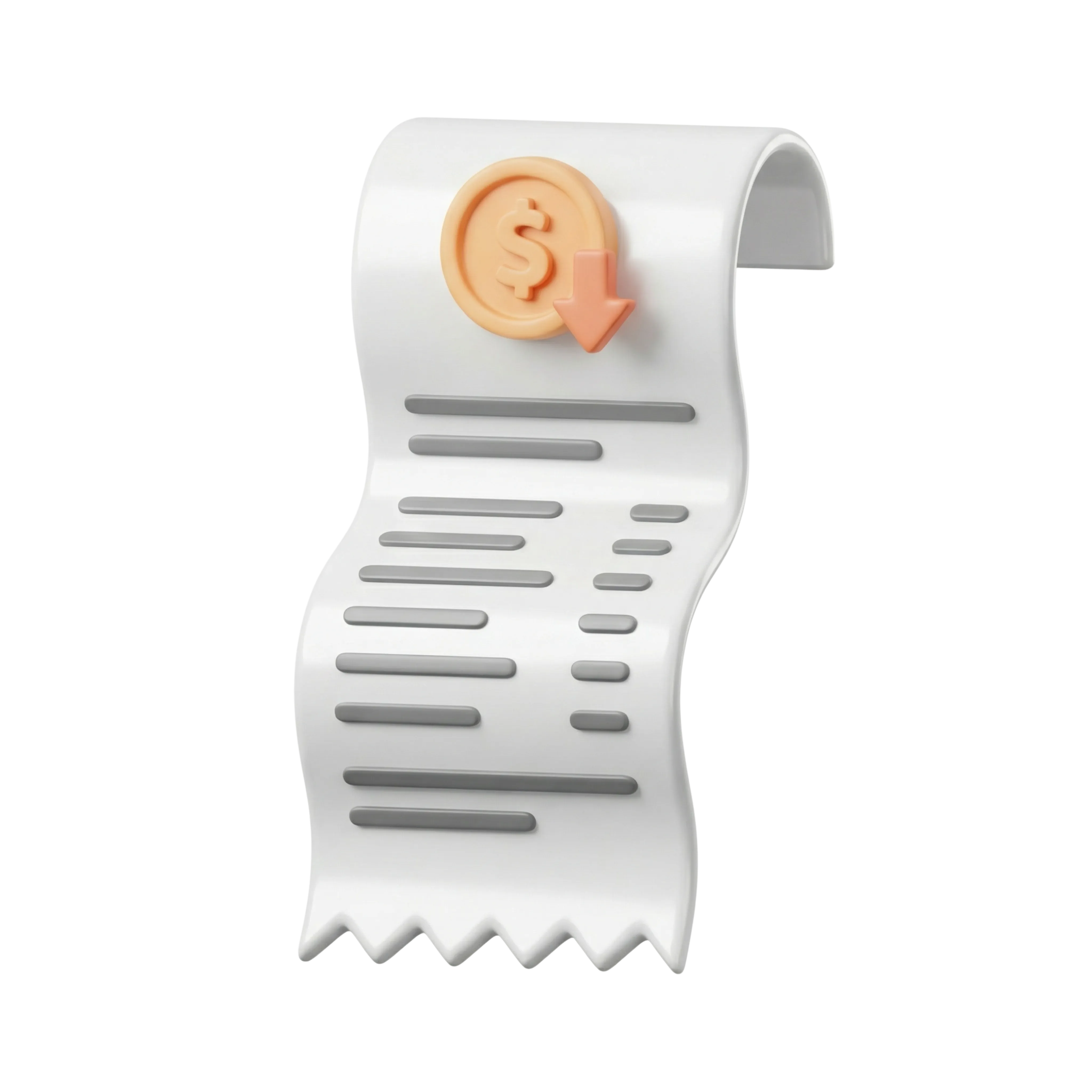A stylized 3D render of a paper receipt with a matte finish, featuring a dollar coin symbol and a downward price arrow. Suitable for use in financial user interfaces, fintech dashboards, mobile apps, or e-commerce icons.