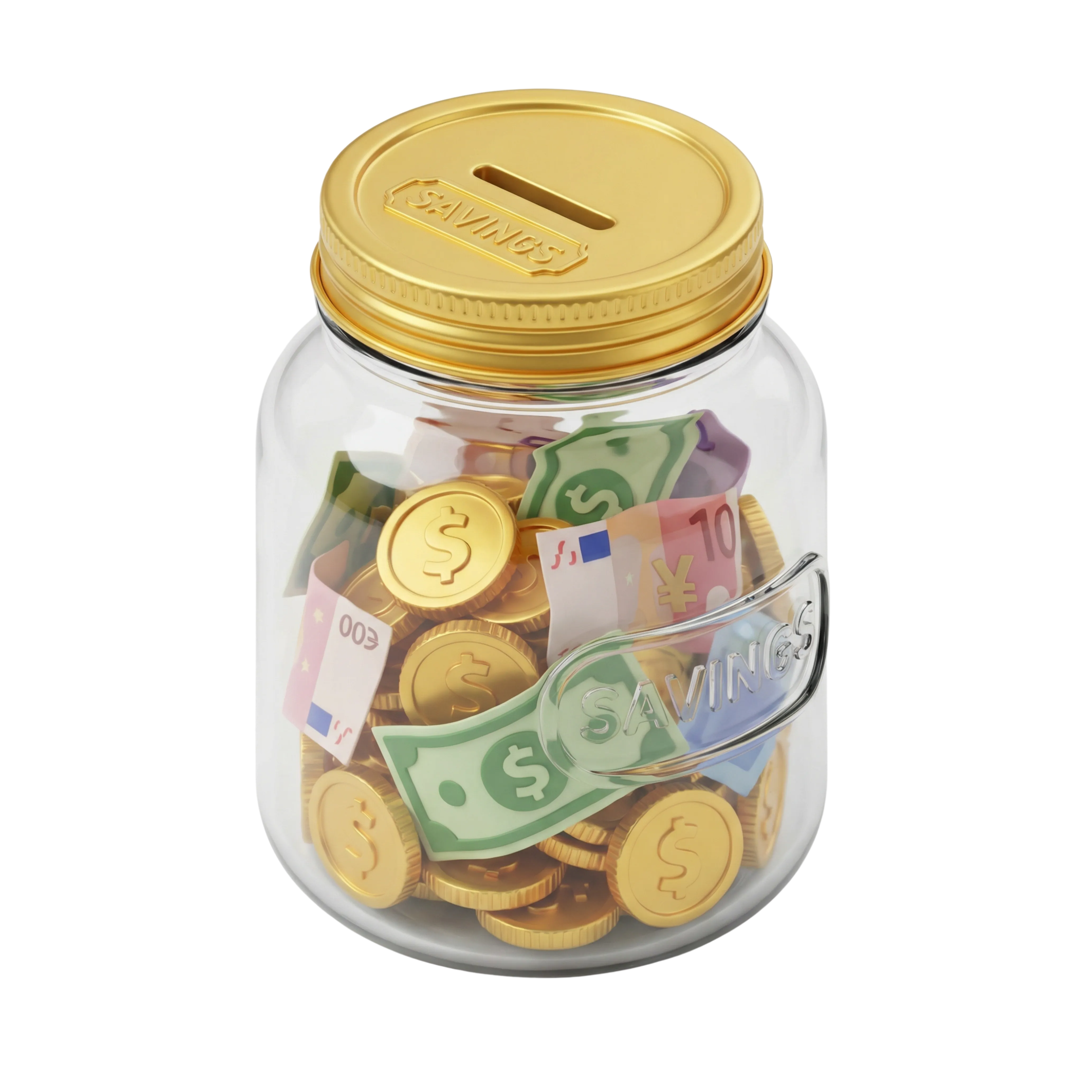 عرض ثلاثي الأبعاد مفصل لبرطمان شفاف للتوفير بغطاء ذهبي معدني عليه كلمة 'SAVINGS'. يحتوي البرطمان على عملات معدنية ذهبية وأوراق نقدية ملونة متعددة الجنسيات، مما يجعله مثالياً لتجسيد مفاهيم الادخار والتمويل الشخصي في تصميم واجهات المستخدم أو الإنفوغرافيك أو الوسائط المالية.