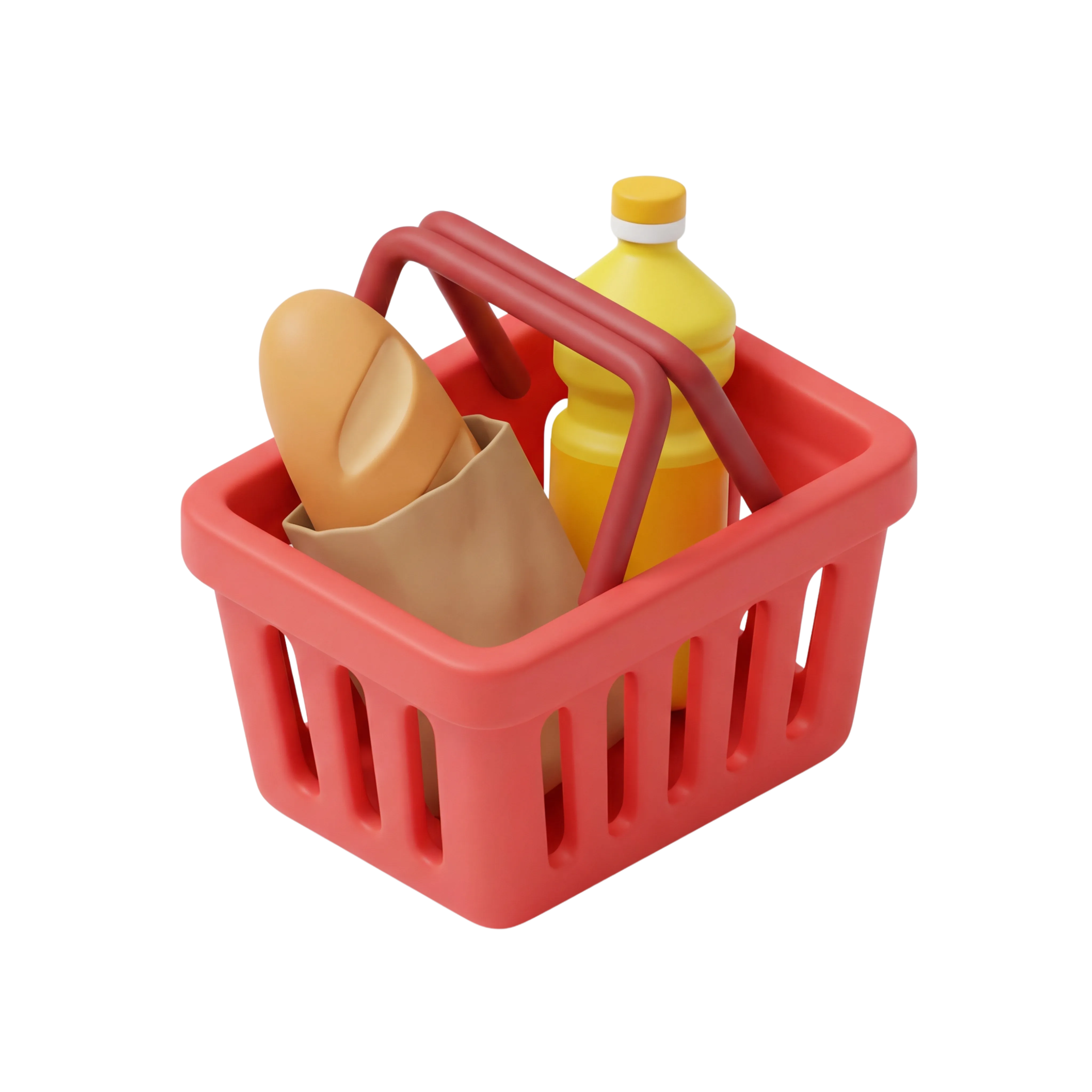 مجسم ثلاثي الأبعاد لأيقونة سلة تسوق بلاستيكية حمراء بمظهر كرتوني ناعم غير لامع، تحتوي على رغيف خبز وزجاجة صفراء. مثالية لتصميمات تطبيقات التسوق والبقالة الإلكترونية وواجهات المستخدم.