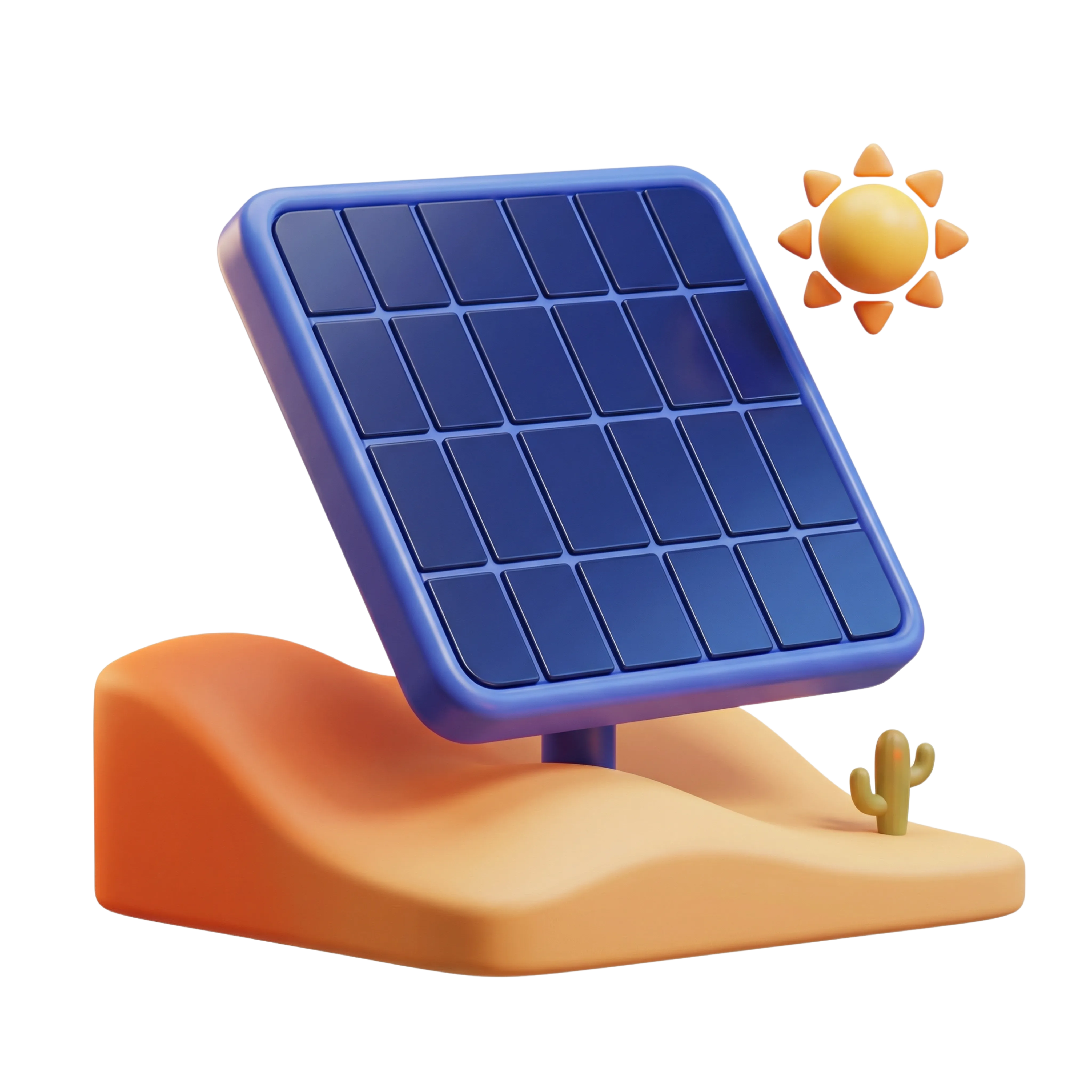 أيقونة ثلاثية الأبعاد بتصميم فني للوحة شمسية بتشطيب أزرق غير لامع، موضوعة على قاعدة بشكل صحراوي تجريدي تضم صباراً وشمساً ساطعة. مثالية لتوضيح مفاهيم الطاقة المتجددة أو التكنولوجيا الصديقة للبيئة أو الاستدامة في المناطق الصحراوية، ويمكن استخدامها في تصاميم التطبيقات أو المواد التعليمية.