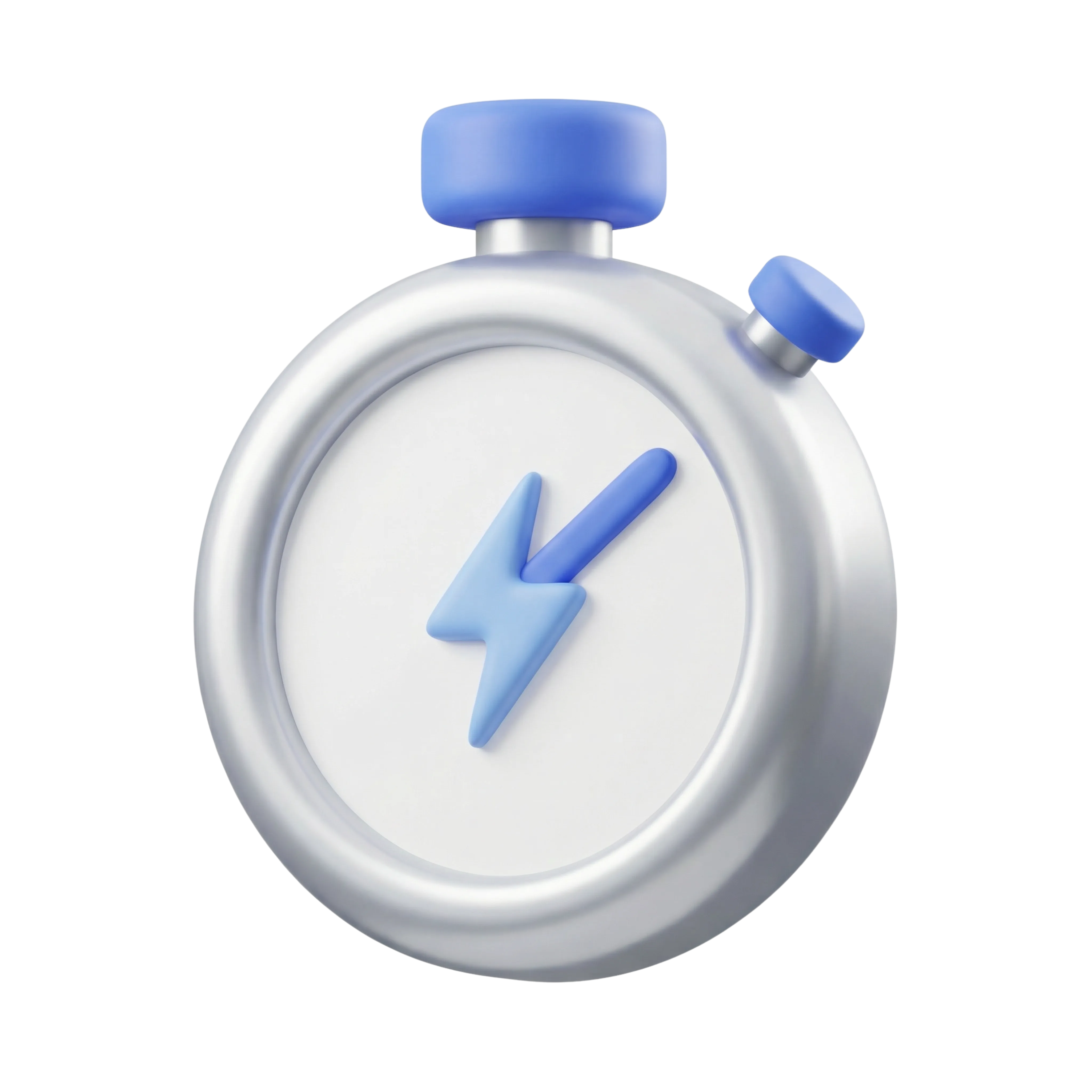 مجسم ثلاثي الأبعاد عالي الجودة لمؤقت ساعة إيقاف بتصميم أنيق وهيكل معدني لامع وأزرار زرقاء غير لامعة مع رمز البرق في المنتصف للدلالة على السرعة أو الدقة، مناسب لتطبيقات الهواتف، وواجهات المستخدم واللوحات الرقمية.