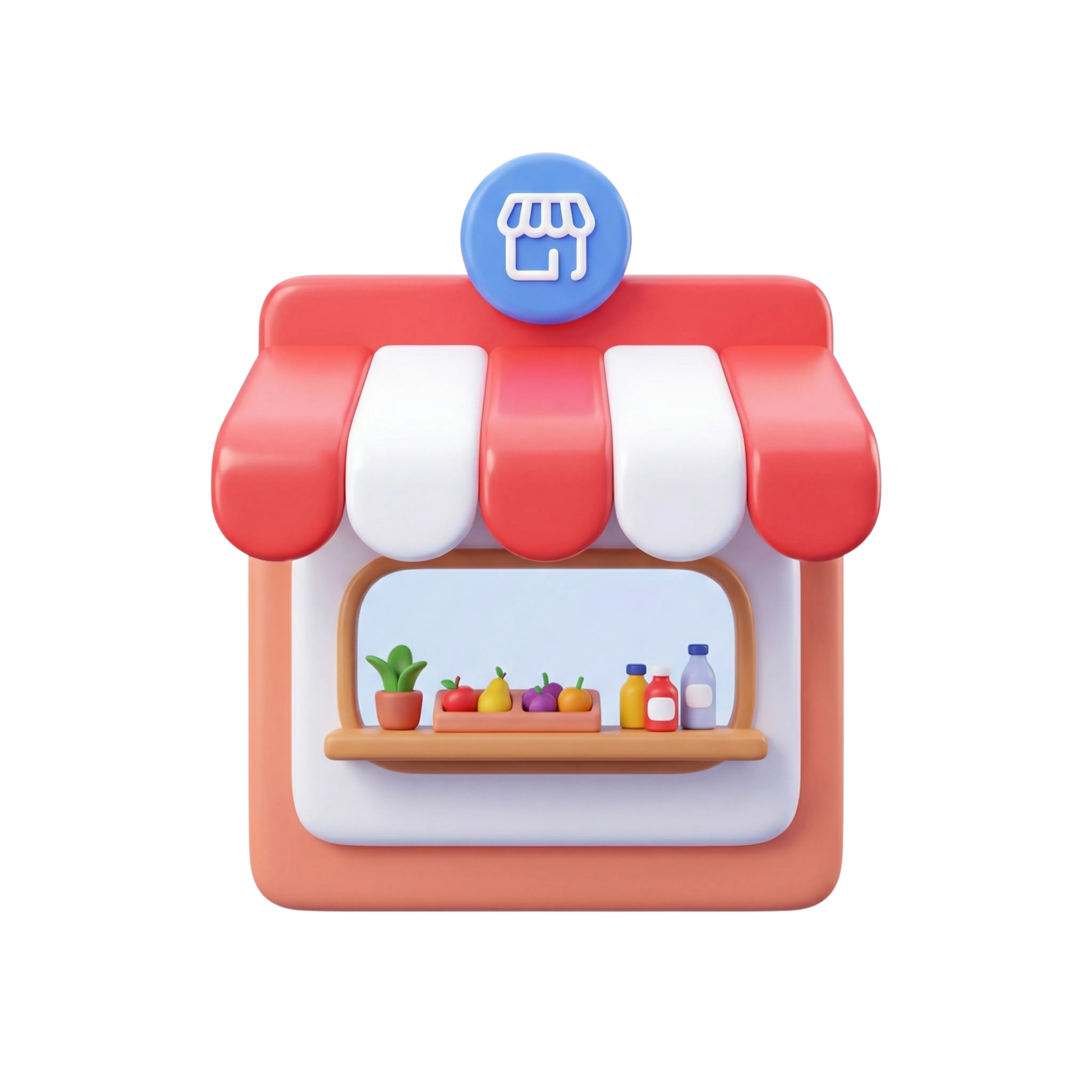 مجسم ثلاثي الأبعاد عالي الجودة لأيقونة واجهة متجر بتصميم لامع يشبه البلاستيك. يظهر الموديل مظلة مخططة باللونين الأحمر والأبيض ورفًا يحتوي على فواكه وخضروات وعبوات وزرعة. مثالي لتطبيقات المتاجر، وتصميم واجهات المستخدم، والعلامات التجارية الإلكترونية.