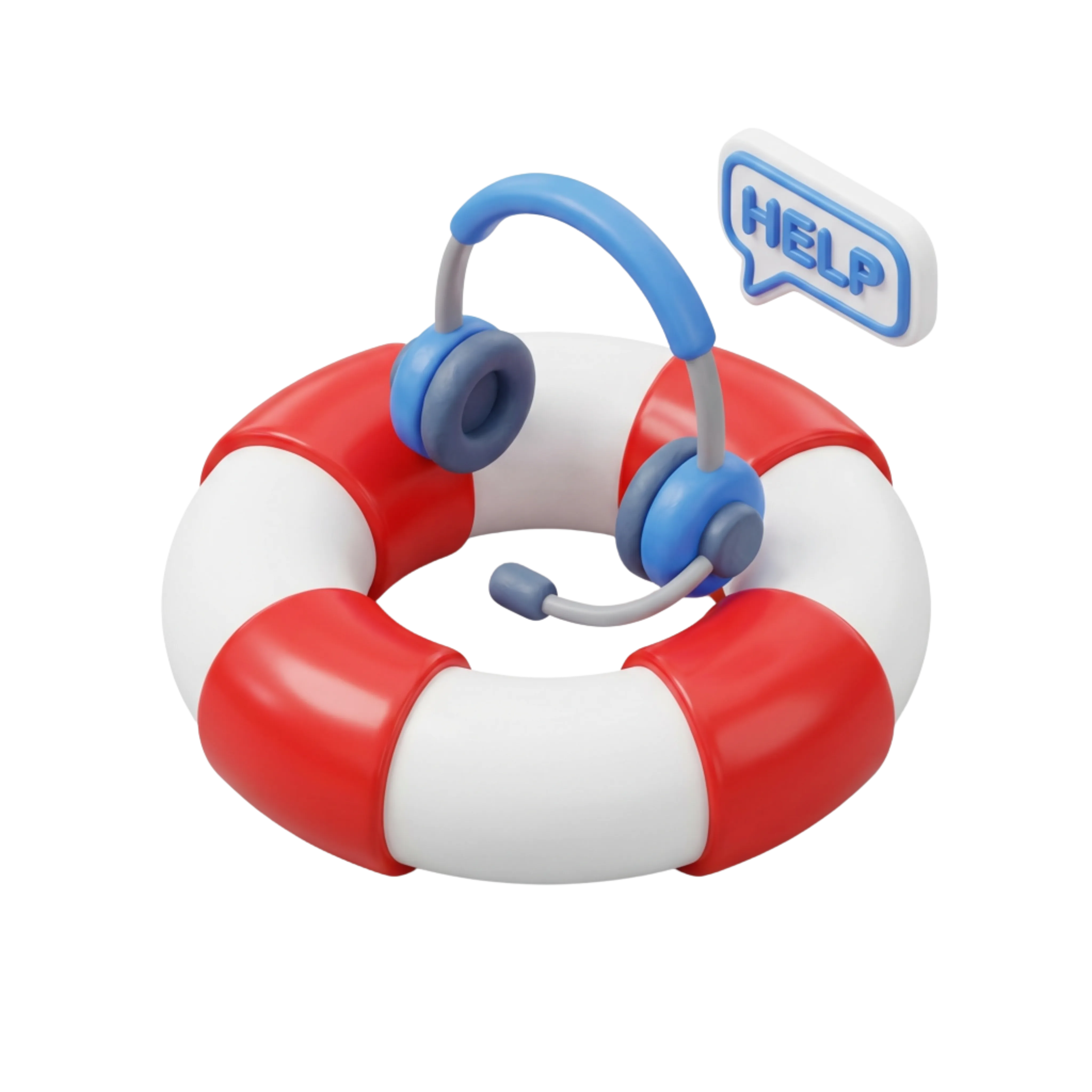 A polished 3D illustration showing a red-and-white lifebuoy combined with a blue headset and a 'HELP' speech bubble, symbolizing customer service, emergency assistance, or tech support. Ideal for UI design, app icons, or online help center graphics.