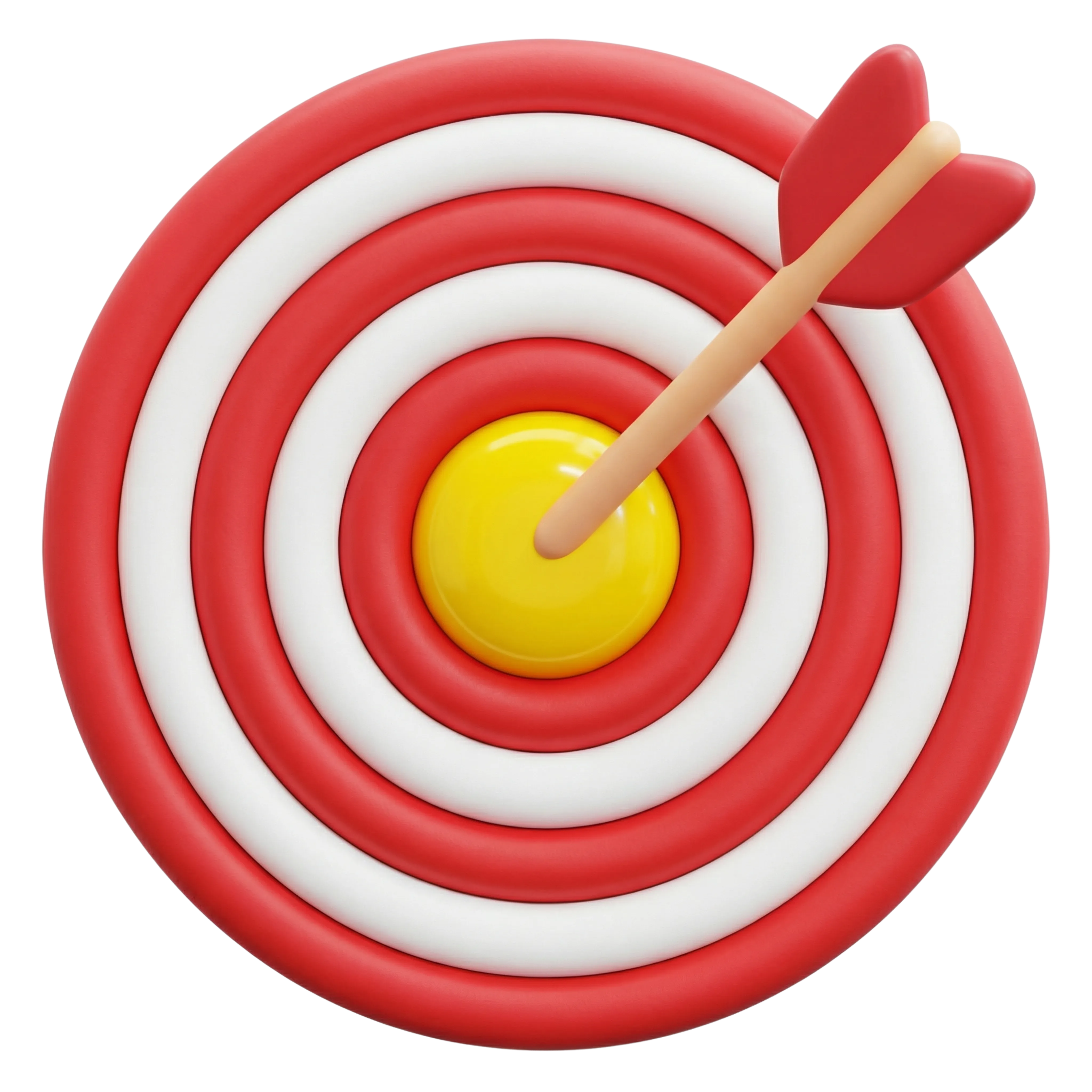 A vibrant 3D rendered icon of a bullseye target featuring red and white concentric circles with a glossy yellow center and an accurately placed arrow. The materials are smooth and semi-gloss, ideal for business, goal setting, or productivity-themed designs in digital or UI applications.