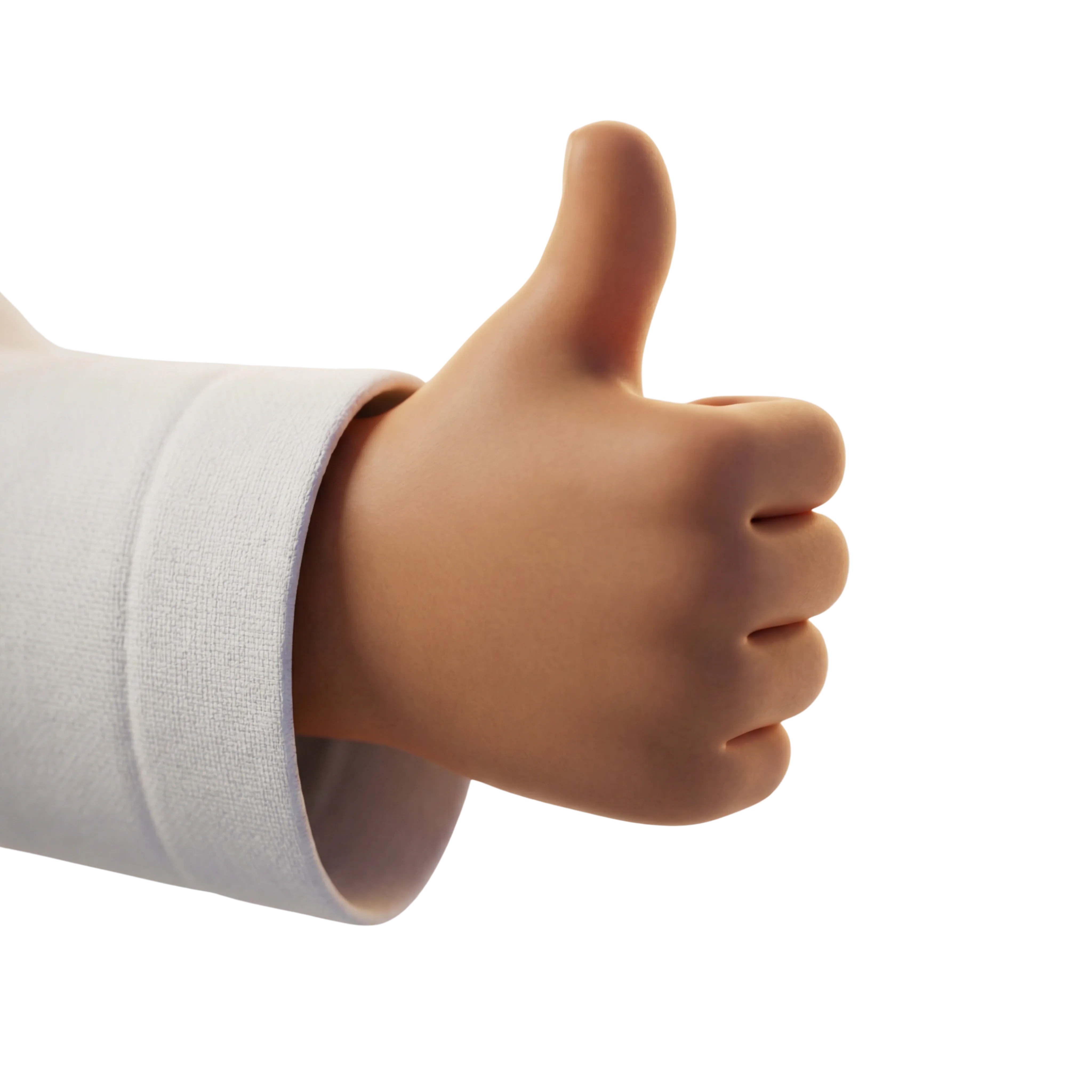 A high-quality 3D render of a stylized thumbs up hand gesture, featuring a matte finish and a detailed fabric sleeve. Ideal for use in user interfaces, emojis, approval indicators, or digital illustrations requiring expressive visuals.