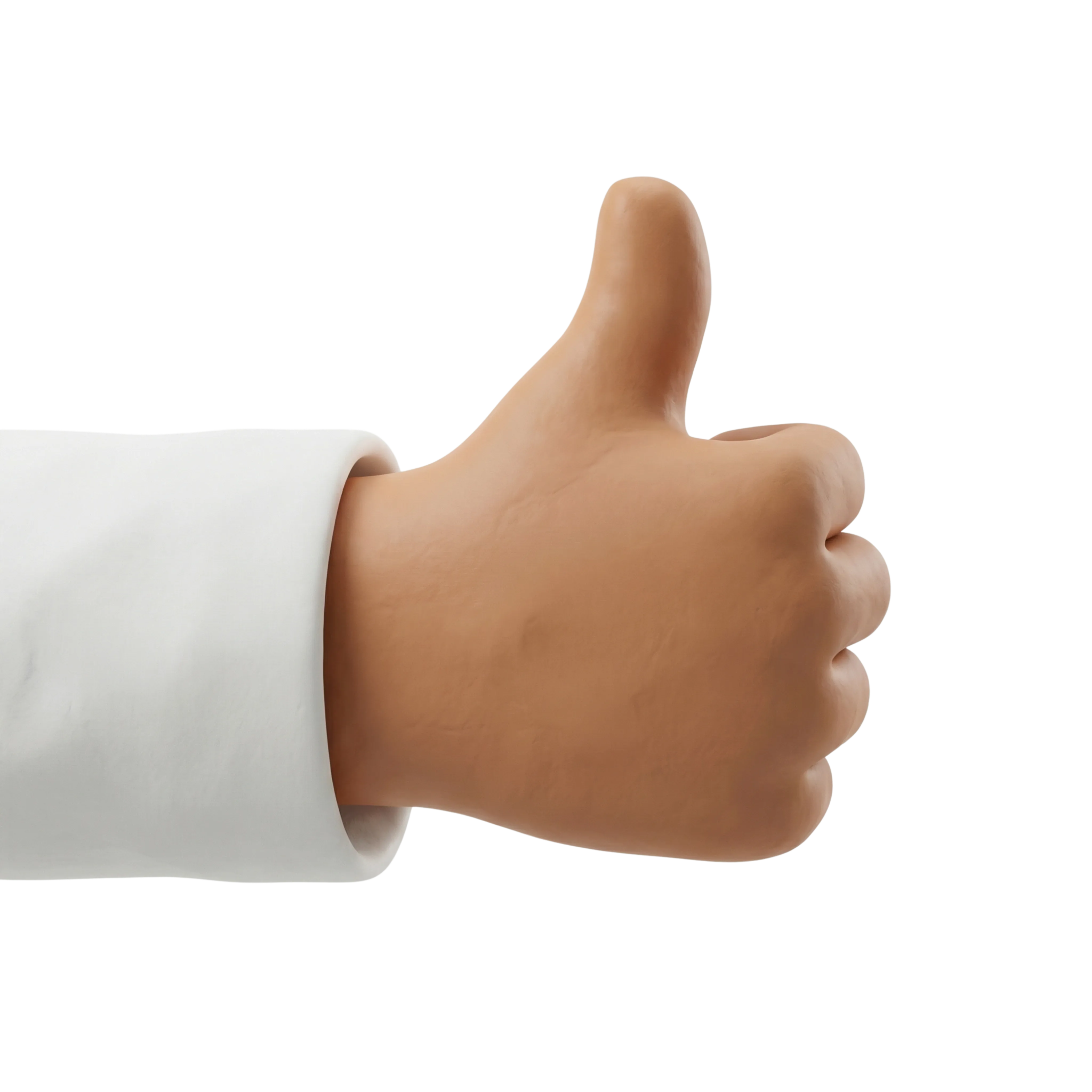 مجسم ثلاثي الأبعاد عالي الجودة لإشارة إعجاب بيد ذات خامة غير لامعة وأكمام بيضاء ناعمة. مناسب لواجهات المستخدم، أيقونات التفاعل، المحتوى التعليمي، أو التصاميم الخاصة بوسائل التواصل الاجتماعي.