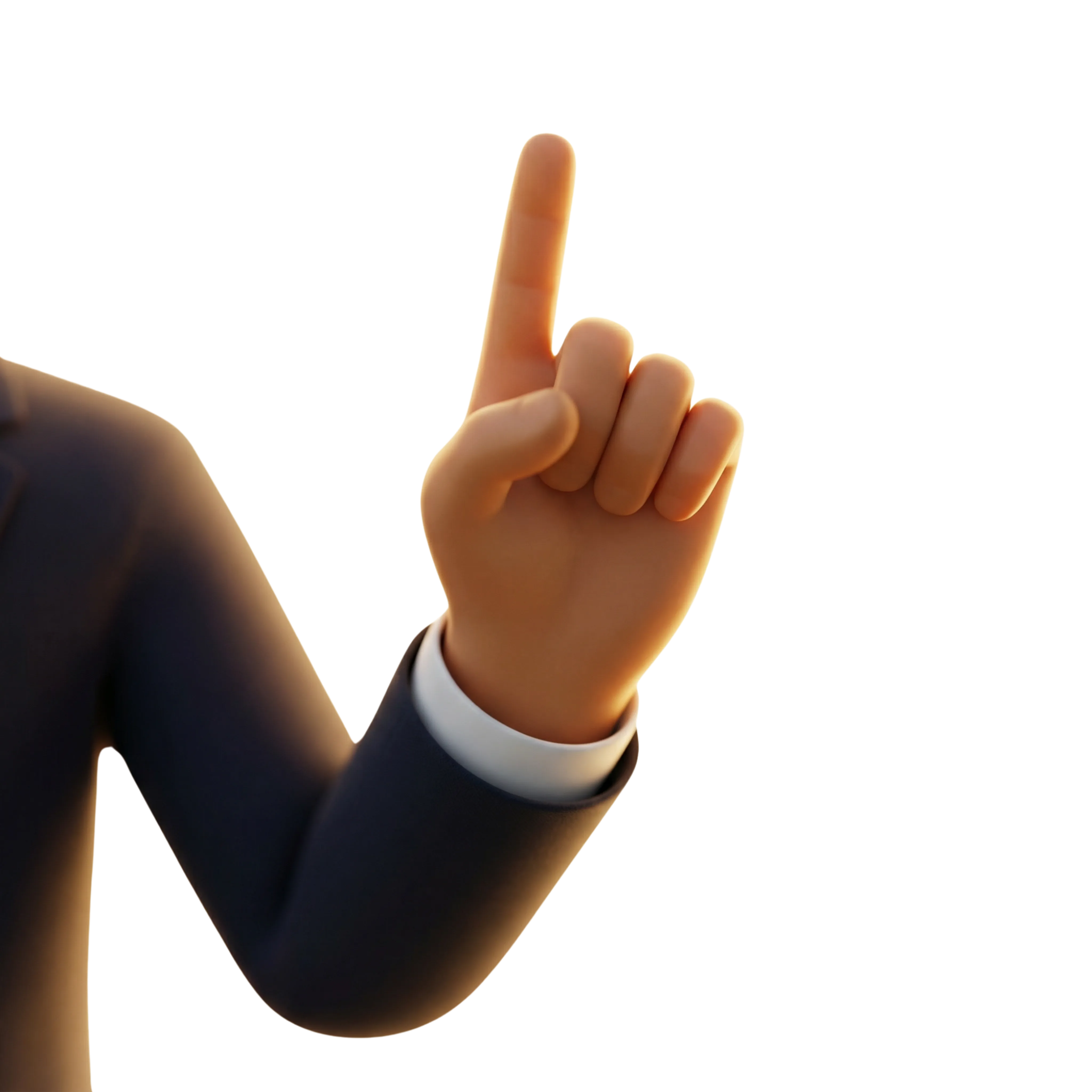 تصميم ثلاثي الأبعاد عالي الدقة ليد كرتونية بإيماءة 'انتظر' أو 'لحظة واحدة' من خلال رفع السبابة، مع ارتداء بدلة رسمية. يتميز المجسم بلمسة نهائية غير لامعة، ومثالي للاستخدام في واجهات المستخدم أو العروض التقديمية أو الرسوم التوضيحية المتحركة.