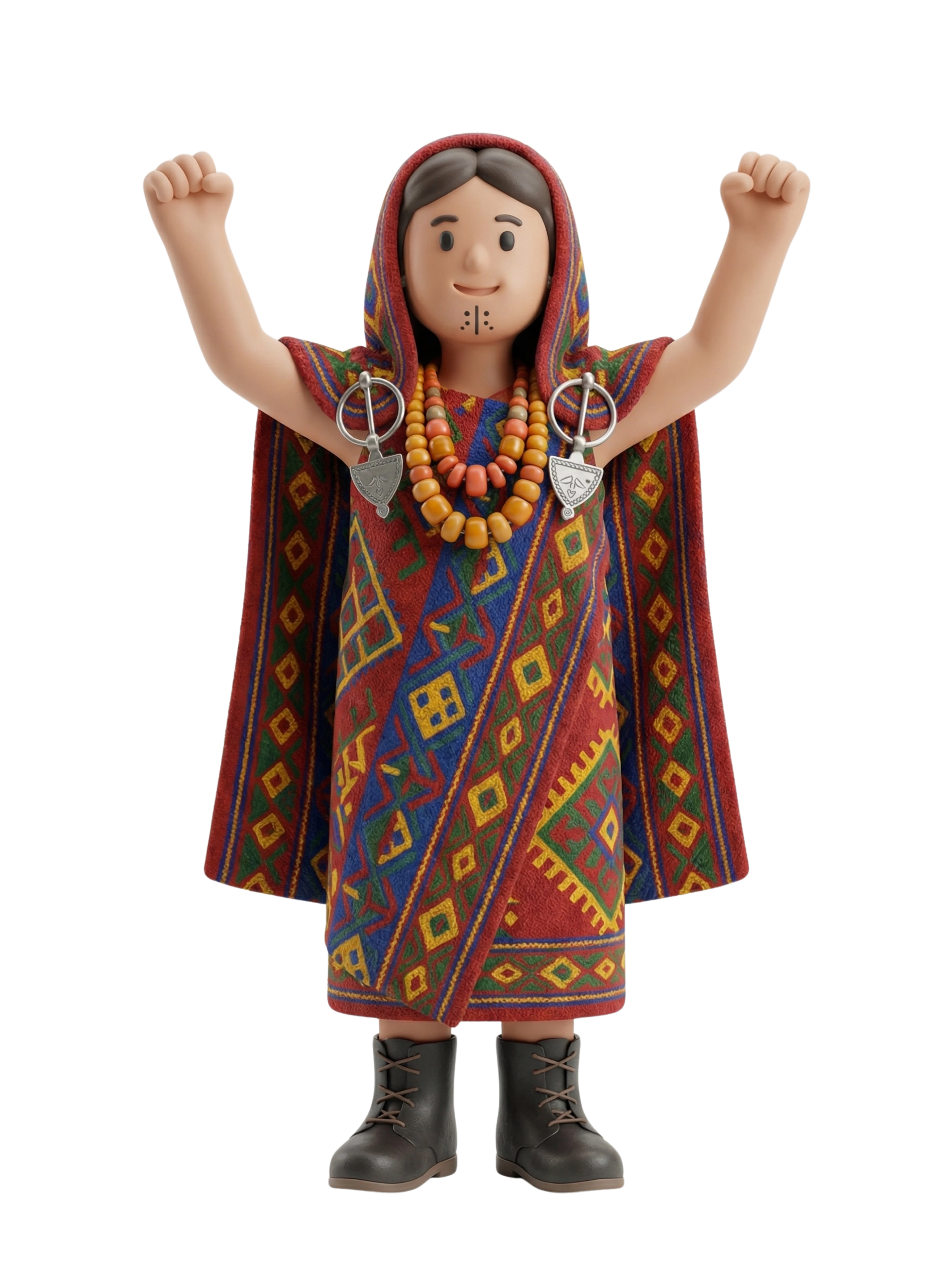 امرأة أمازيغية كبرى ترفع قبضتيها بفخر ووحدة، مرتدية عباءة تقليدية مزخرفة بالألوان الزاهية، ومجوهرات فضية، وقلائد خرز تقليدية، مع وشوم قبلية تبرز عمق الإرث الثقافي والتمكين النسائي.
