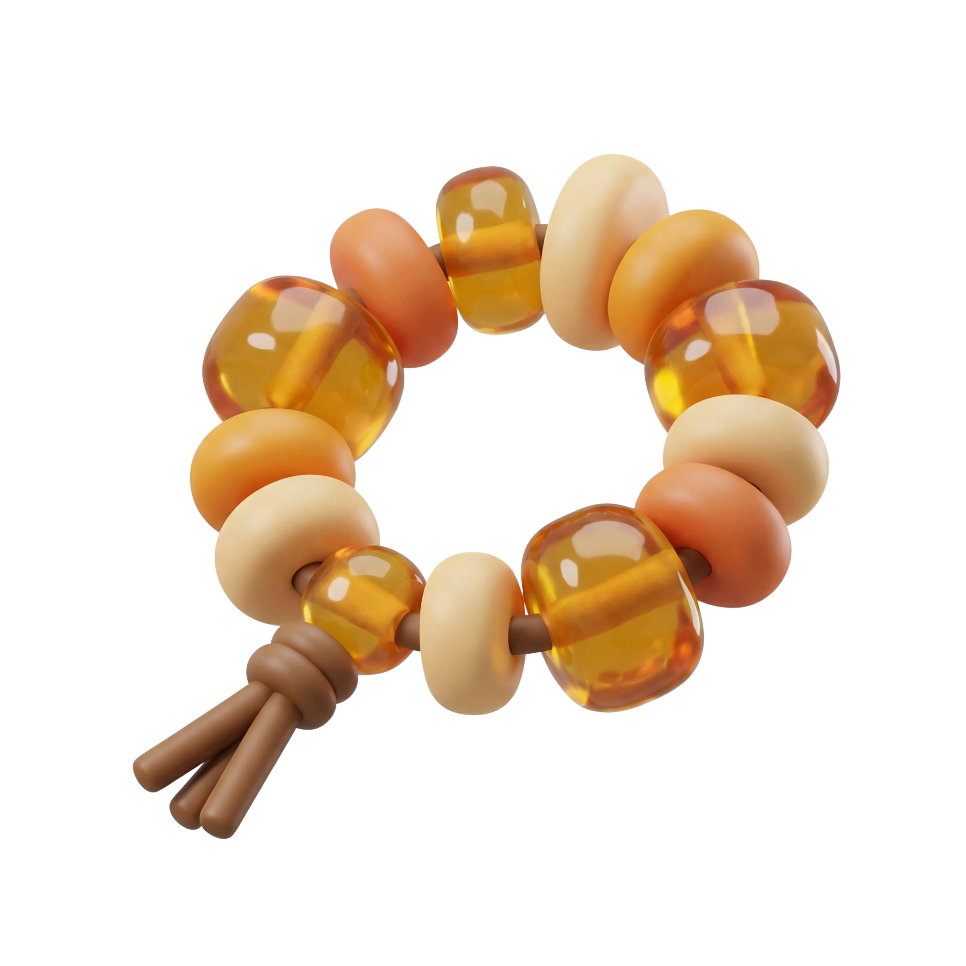 A high-quality 3D render of a beaded bracelet-style object consisting of glossy amber-like translucent beads alternating with soft matte clay-tone discs. The object features a tied brown string with three tapered ends, commonly representing handmade or decorative spiritual accessories. Ideal for UI icons, wellness branding, or 3D visualization projects.