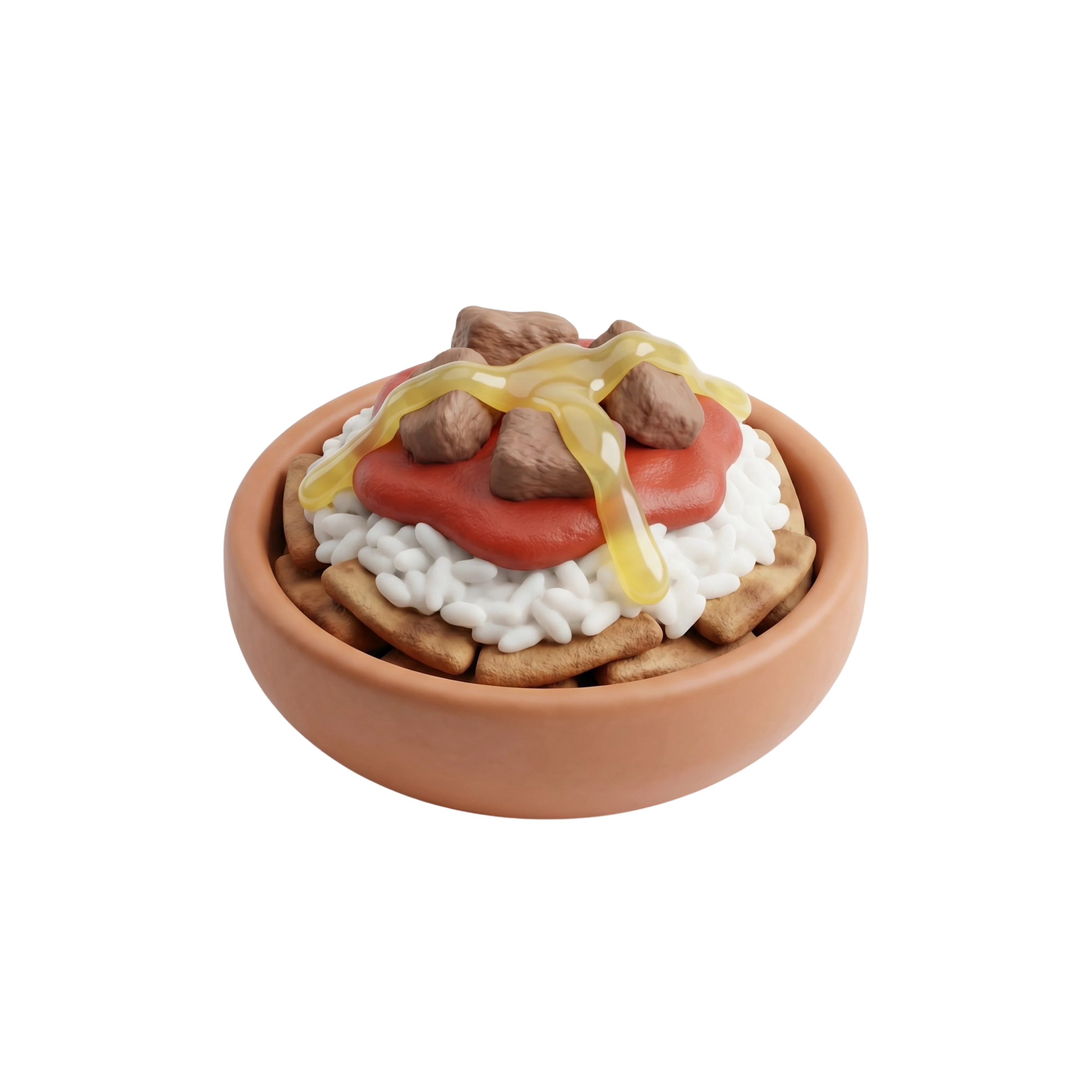 A traditional Egyptian comfort dish featuring crunchy toasted pita bread, fluffy rice, tender beef chunks, and a vibrant tomato sauce, all brought together with a bold garlic-vinegar drizzle that adds a zesty punch.