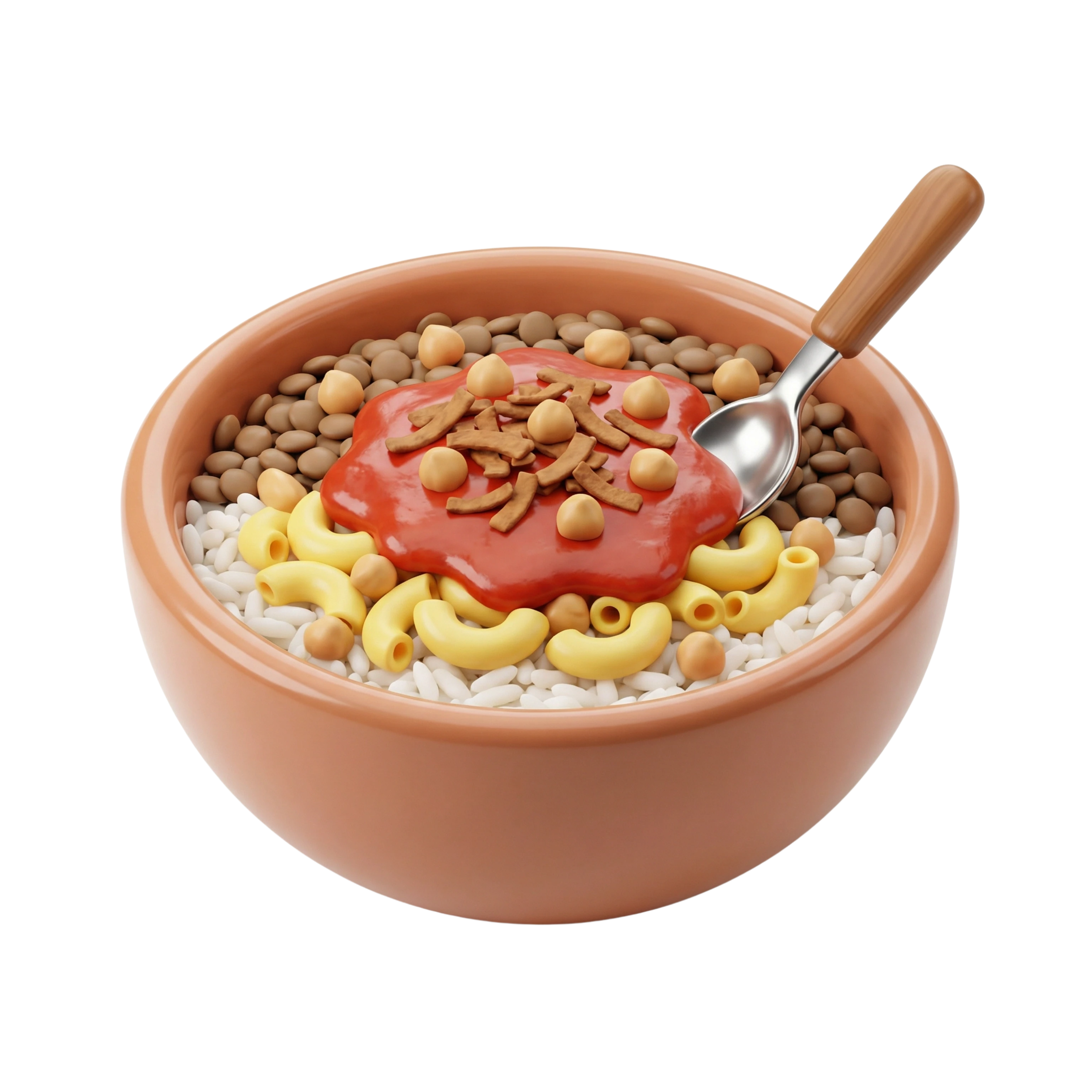 طبق شعبي مصري مريح يتكون من طبقات من الأرز الناعم، المكرونة المسلوقة، العدس الأسود، والحمص الطري. يُزين بصلصة طماطم حارة ومنعشة ويُختتم بالبصل المقلي المقرمش ليمنح طعمًا ونكهة لا تُقاوم.