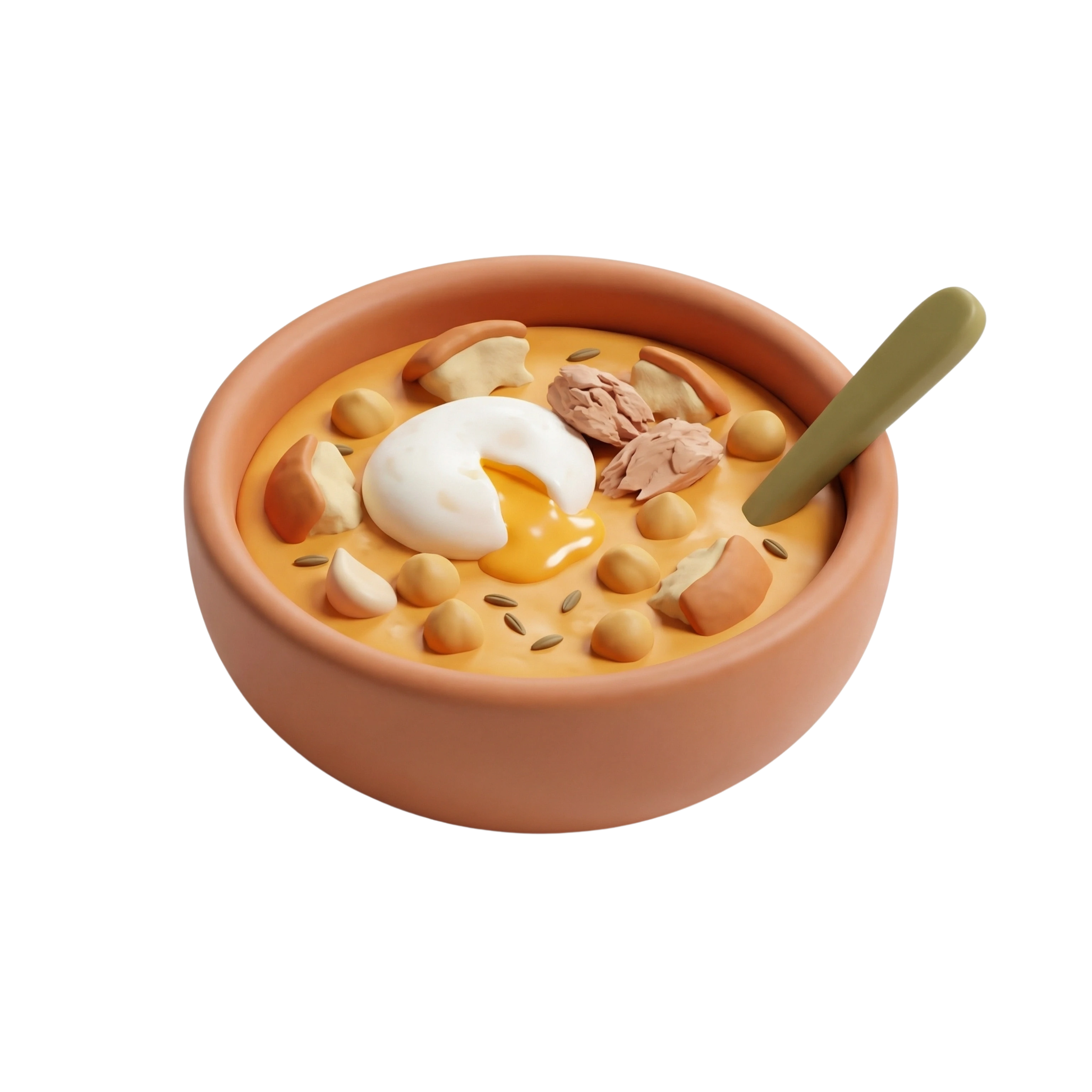 طبق تونسي شعبي دافئ يتكون من الحمص الطري المطبوخ في مرق بالثوم والتوابل مع نكهات قوية من الكمون. يُقدم مع قطع من الخبز المحمص والتونة، وتتوجه بيضة مسلوقة طرية، ليمنحك مزيجًا غنيًا من القوام والنكهات المتوسطية.