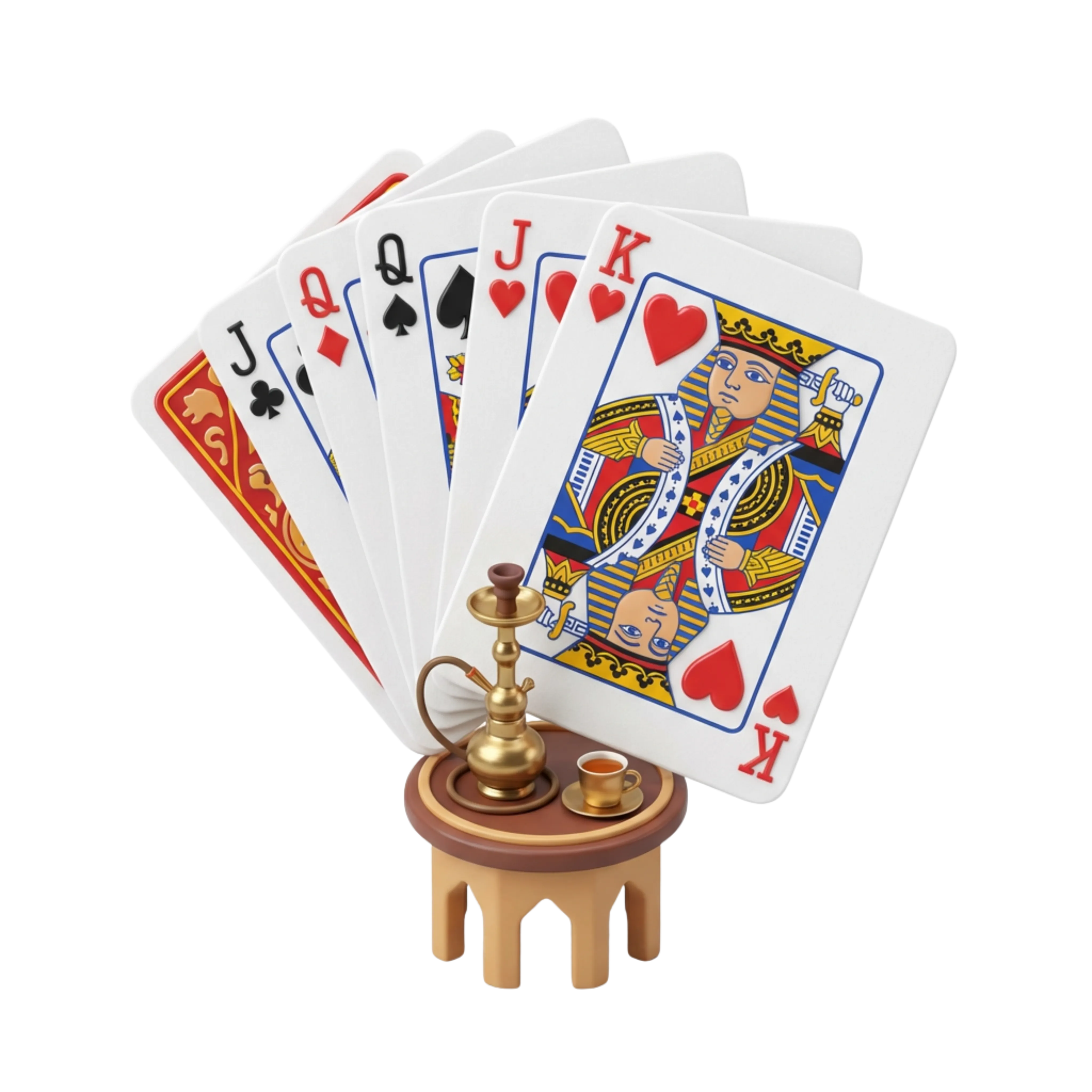مجسم ثلاثي الأبعاد دقيق لأوراق لعبة البلوت موزعة بشكل مروحي، خلف شيشة تقليدية صغيرة وطقم قهوة عربية موضوع على طاولة بنمط مجلس تراثي. الأوراق بلمسة شبه لامعة والشيشة بتفاصيل معدنية نحاسية. مناسب لتصميمات رقمية ثقافية أو موضوعات ترفيهية.