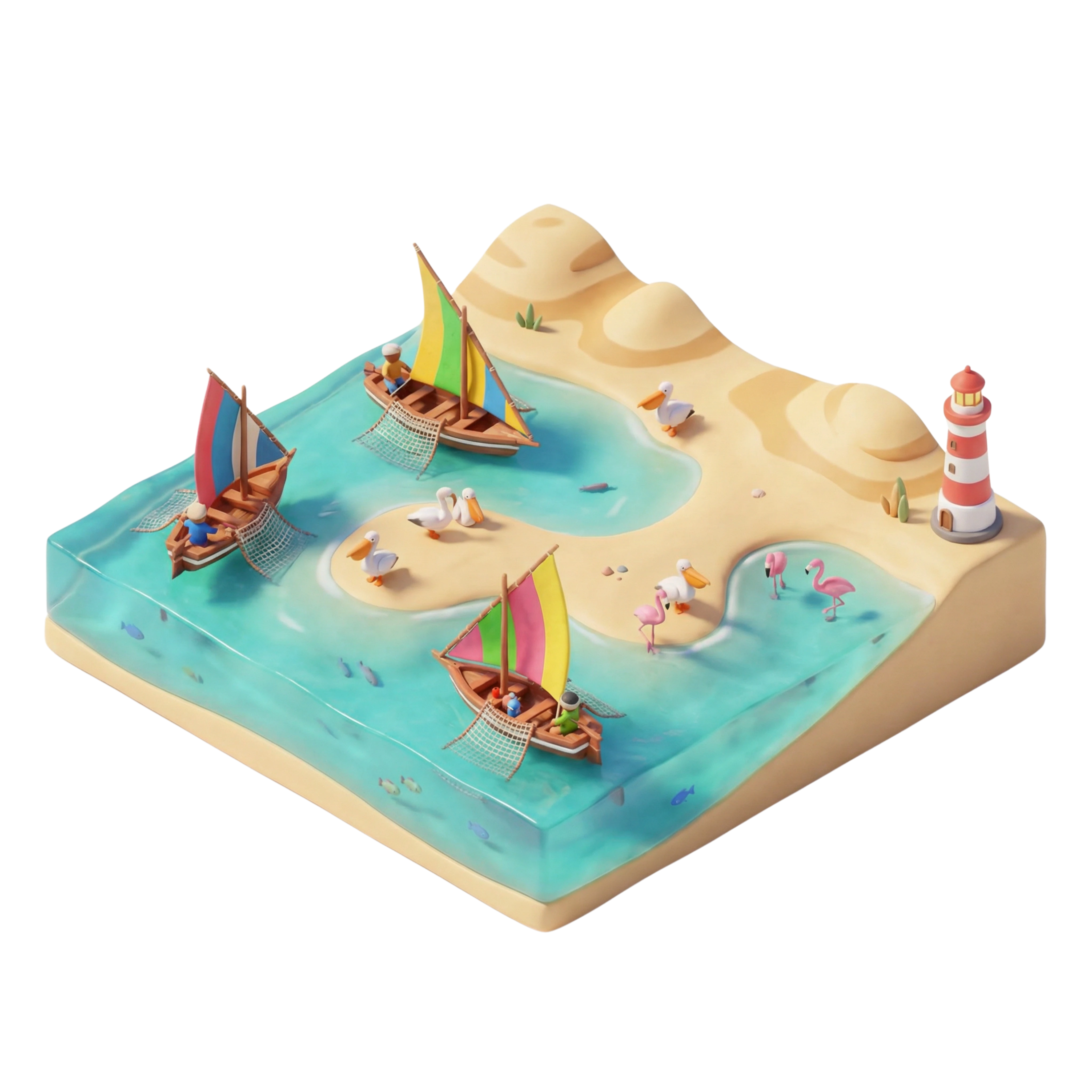 Banc d'Arguin National Park, located along the Atlantic coast of Mauritania, is a UNESCO World Heritage site renowned for its unique blend of coastal desert and marine biodiversity. The park is a critical habitat for migratory birds and is known for its traditional fishing methods using sailboats by the local Imraguen people. The area's natural beauty, with sweeping sands, lagoon-like shallows, and traditional wooden boats, captures the essence of sustainable coexistence between culture and nature.